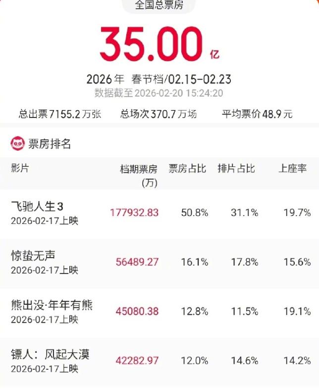 截止于2月20日,春节档票房已经突破35亿,《飞驰人生3》的票房突破17亿,占比将近百分之五十,这样的情况出现,很多网友都认为《飞驰人生3》提前锁定春节档票房冠军。