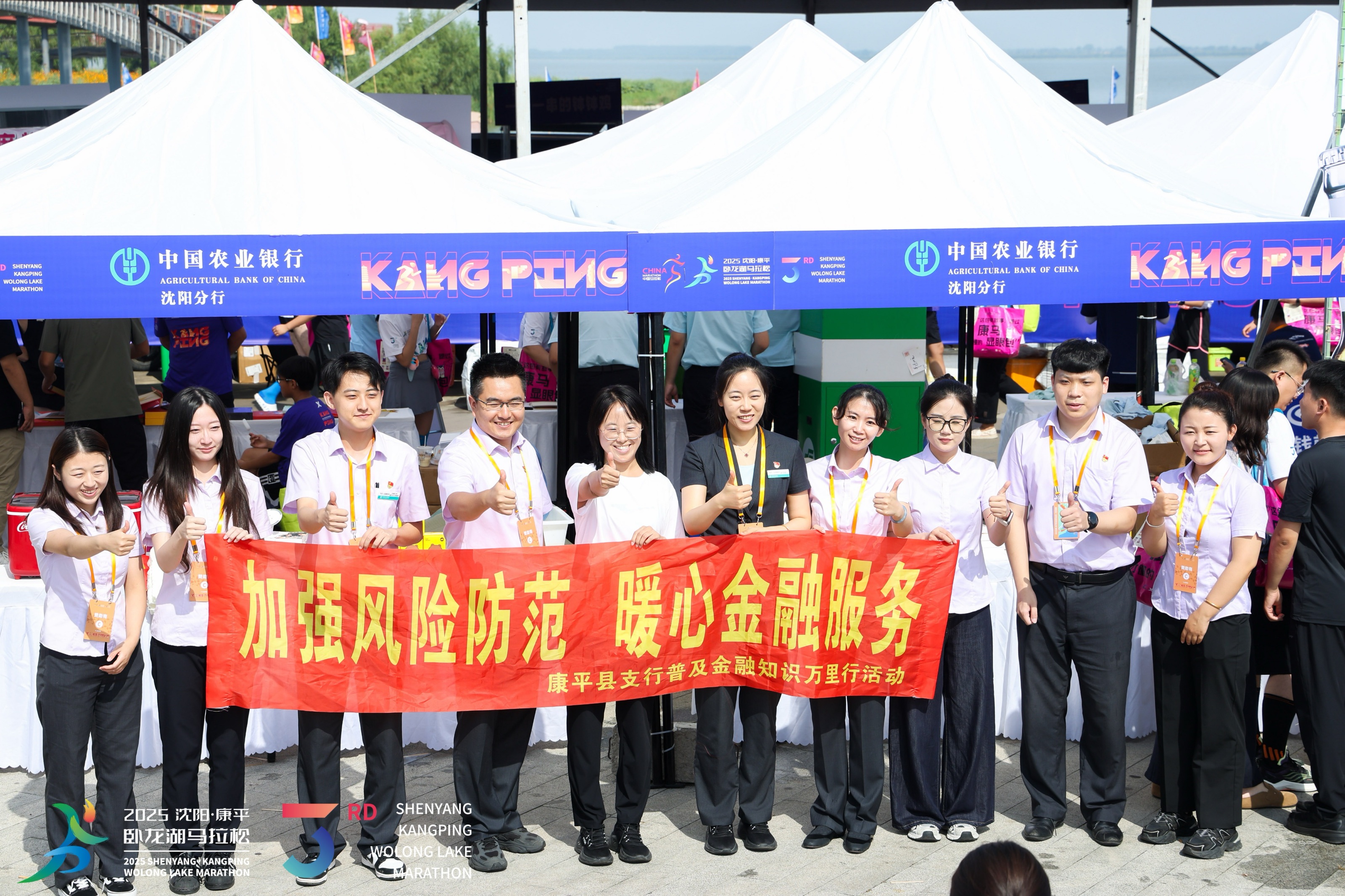 赛事期间,康平县支行积极对接政府机构,做好赛事辅助和宣传工作。支行非当班青年员工全部参与志愿服务,分别在赛前“马博会”、领物现场、草坪音乐节以及赛事当天卧龙湖马拉松起终点、4km补给点等多个区域,开展志愿服务,提供饮用水、冰毛巾、赛事指引等便捷服务,暖心的赛事志愿者服务得到县委县政府的高度认可:全辖跑步爱好者积极参与全程马拉松、半程马拉松、10km欢乐跑等赛事项目,助力家乡体育赛事发展:零售条线同步设立金融消费者权益保护知识咨询点,全方位展示金融支持地区发展的精神面貌。