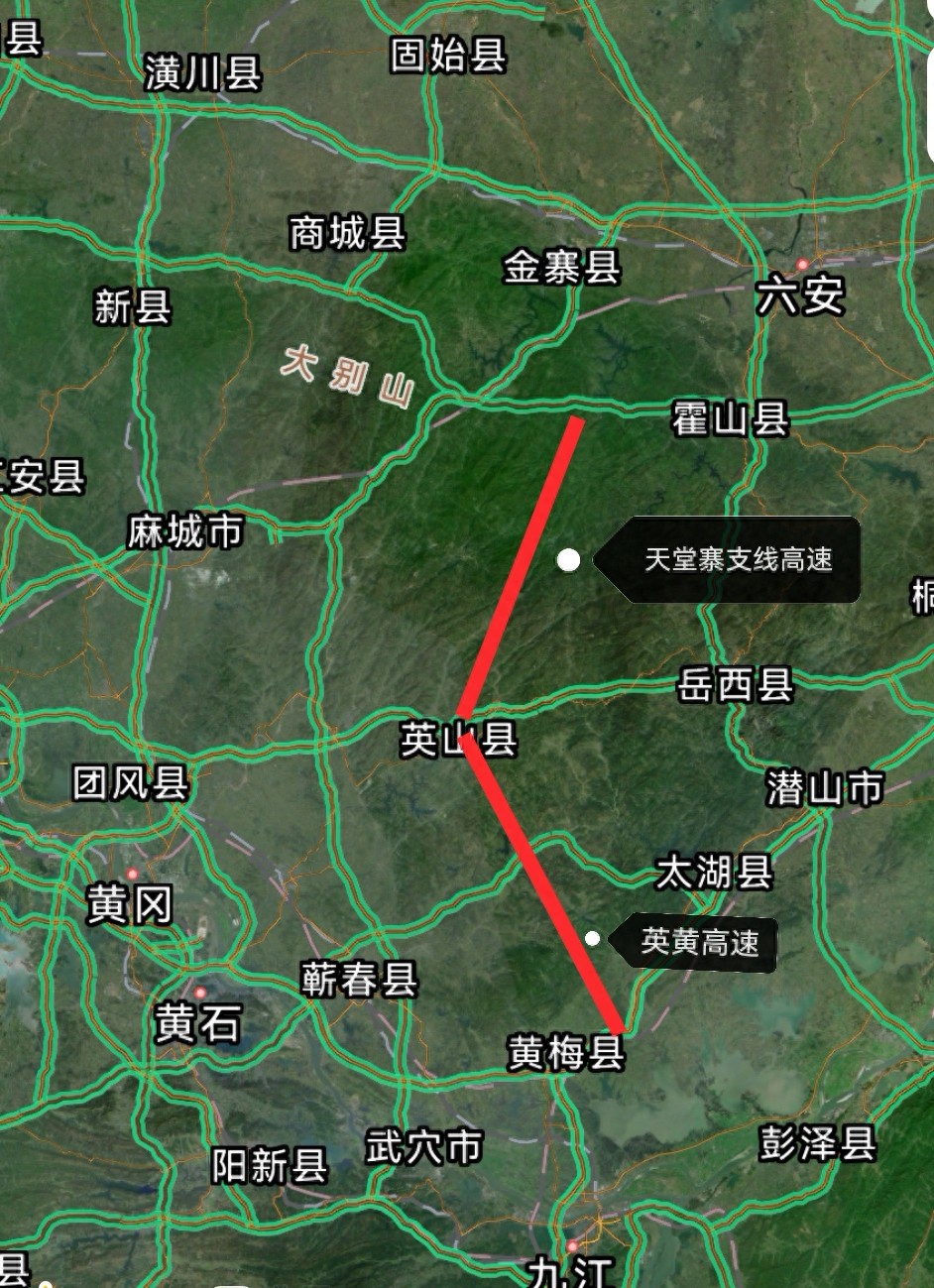 穿越大别山区的高速公路有两部分组成,一部分为安徽省建设的天堂寨支线高速公路,另一部分为湖北省建设的英山至黄梅高速公路。