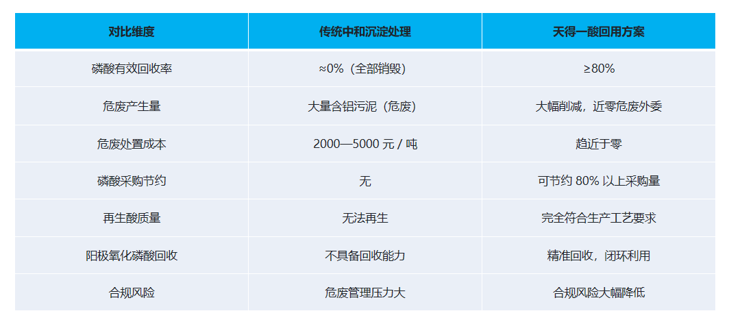核心效益测算:年使用磷酸 500 吨的铝型材企业,导入天得一酸回用方案后,预计每年可节约磷酸采购成本 150—200 万元,同时削减危废委外支出 50—100 万元,综合经济效益十分显著。