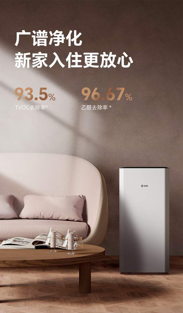 不用依赖开窗通风,阴雨天、冬季也能快速净化,单台就能覆盖全屋,不用多机拼接,新装修家庭 3 个月就能安心入住,比传统通风 + 吸附式净化器的效率提升 60%。