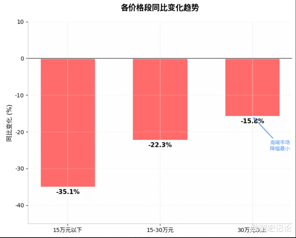 (3)高端市场(30万元以上):销量36.4万辆,占比20%,同比下滑15.8%,降幅低于整体市场,高端消费者对价格敏感度较低,需求相对稳定。