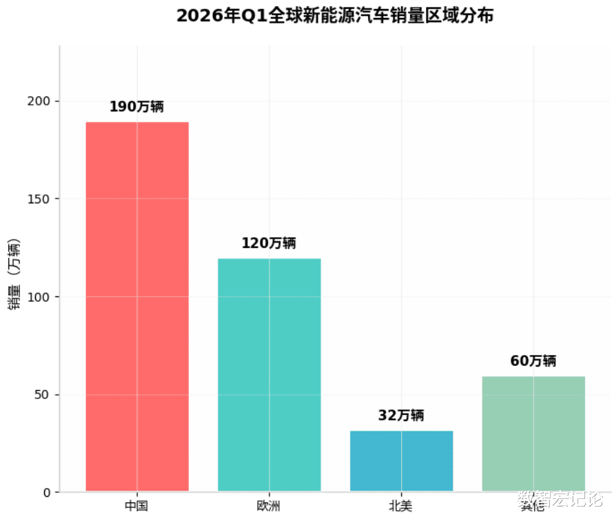 区域分布:区域分化特征极为鲜明,中国仍是全球最大的电动汽车市场,一季度销量达190万辆,接近全球总销量的半数,较去年同期同比下滑21%,核心受国内新能源购置税政策切换、消费需求前置释放等因素影响;欧洲依旧为全球第二大电动汽车市场,一季度销量达120万辆,同比增长27%,欧盟严格的碳排放法规推动新能源汽车需求持续提升,成为全球新能源市场的核心增长极;北美市场一季度销量降至32万辆,较去年同期同比下滑27%,主要受新能源补贴退坡、传统燃油车优惠政策影响,消费者购车意愿转向燃油车;其余市场(含东南亚、大洋洲、非洲等)合计销售电动汽车60万辆,同比大涨79%,其中新西兰纯电动汽车销量同比翻番,澳大利亚电动汽车销量同比增长111%,新兴市场成为新能源汽车增长的新亮点。
