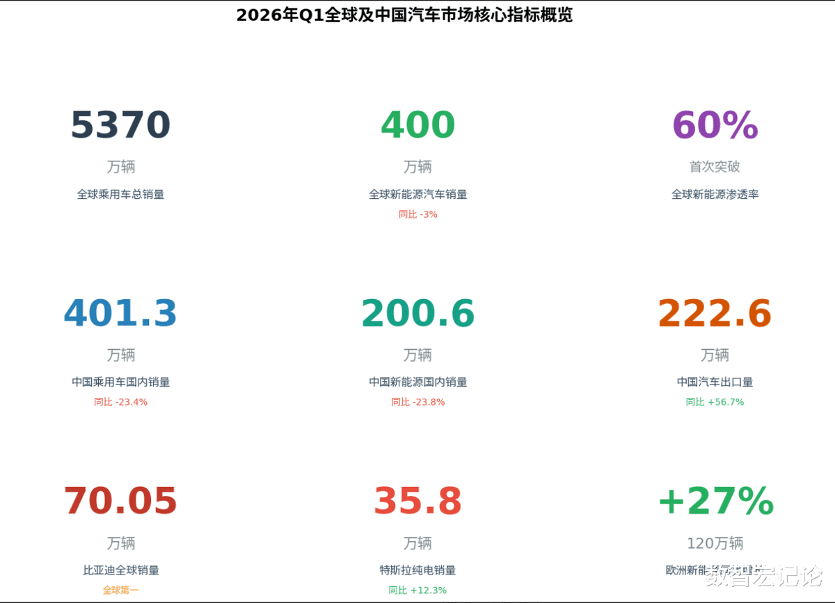 (一)全球乘用车整体出货概况结合行业权威数据披露,2026年第一季度全球乘用车总销量达5370万辆,市场整体呈现“区域分化、燃油车收缩、新能源主导”的格局,其中传统燃油乘用车销量2130万辆,同比下滑28.6%;新能源乘用车销量3240万辆,同比微降3%,新能源渗透率首次突破60%,标志着全球汽车市场正式进入电动化主导的新阶段,燃油车时代逐步走向落幕。