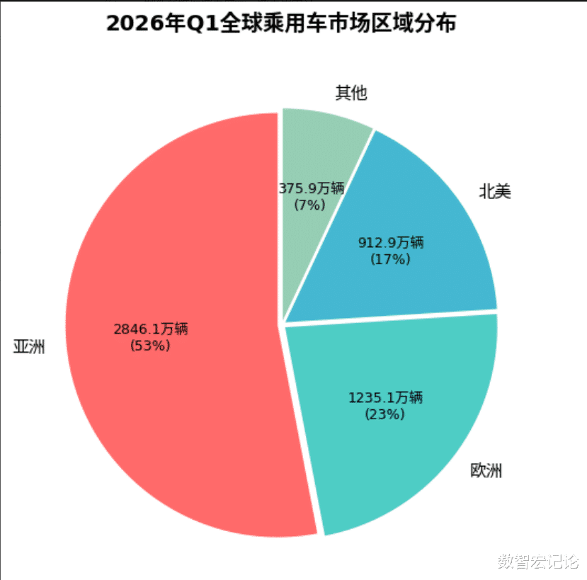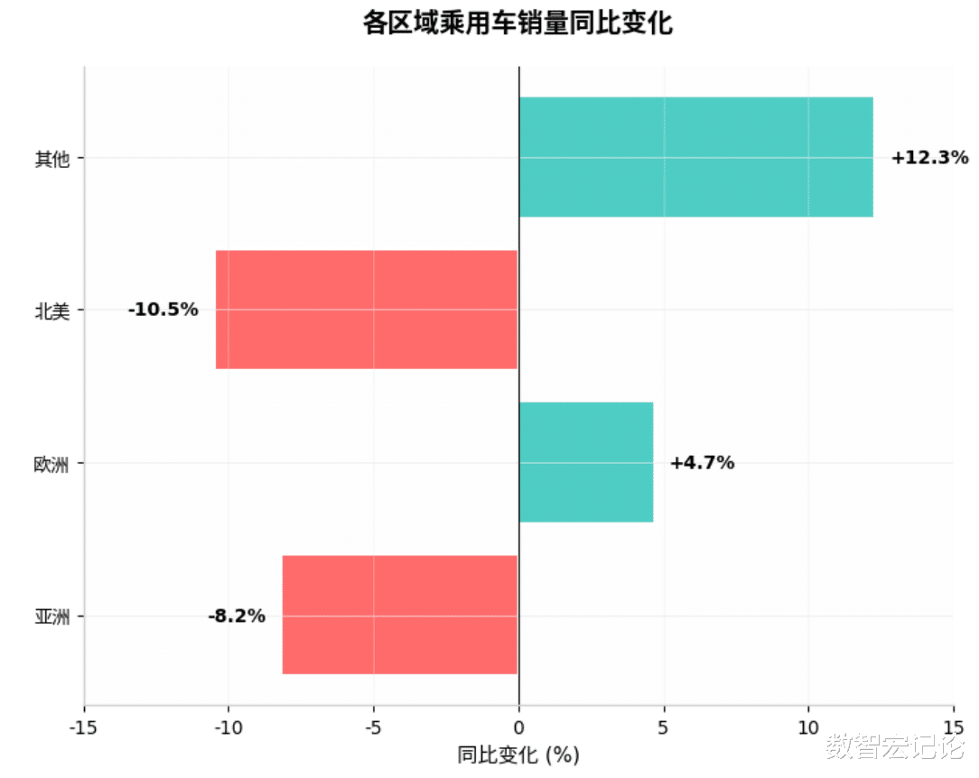 南美、非洲及大洋洲等其他市场合计销量375.9万辆,占比7%,同比增长12.3%,成为全球乘用车市场的增长补充。