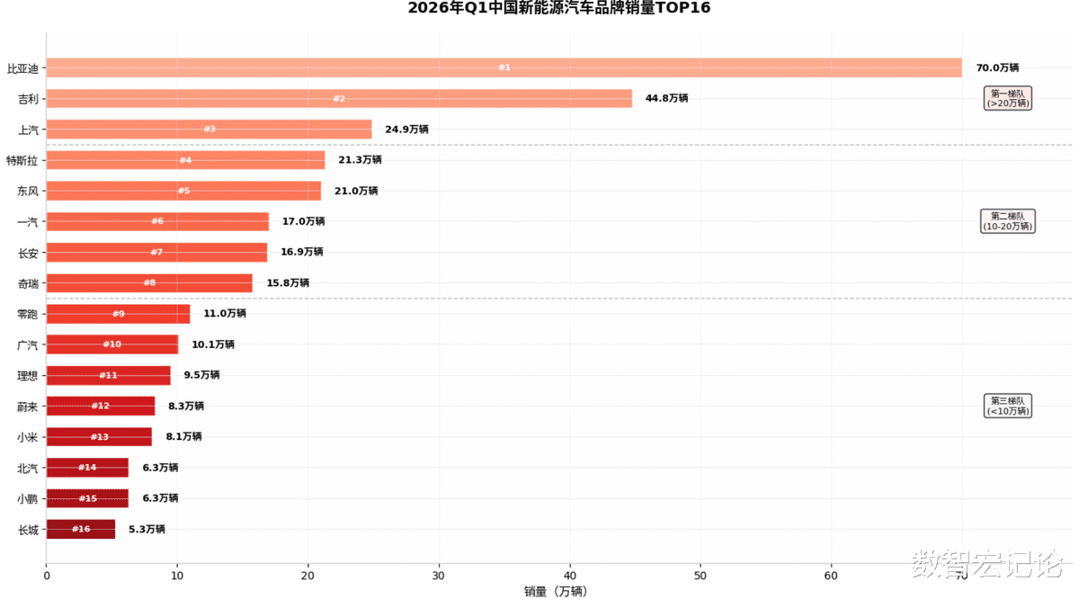 (6)其他重点品牌:一汽(17.0万辆)、长安(16.9万辆)、奇瑞(15.8万辆)、零跑(11.0万辆)、广汽(10.1万辆)、理想(9.5万辆)、蔚来(8.3万辆)、小米(8.1万辆)、北汽(6.3万辆)、小鹏(6.3万辆)、长城(5.3万辆)依次位列第六至第十六位。其中,零跑汽车登顶国内新势力榜首,同比增长25.8%;小米汽车作为科技跨界造车代表,一季度销量逼近8万辆,成为新势力中增长最快的品牌之一;蔚来、理想均实现同比大幅增长,新势力格局出现明显调整。