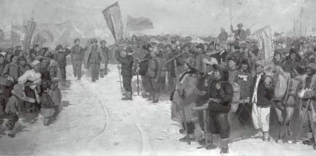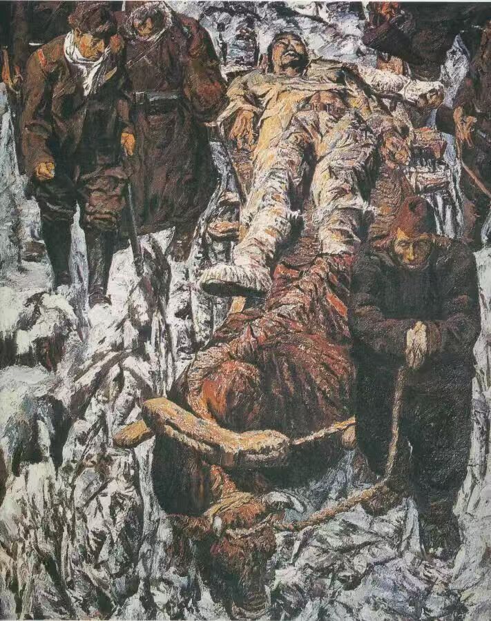画面中,杨靖宇将军躺在皑皑白雪之中,身体呈现出一种不屈的姿态,仿佛即使倒下,精神依然屹立。他处于画面的中心位置,成为视觉的焦点,这种构图手法巧妙地将观者的视线引向英雄,突出了主题。周围环绕着几名日本军人,他们面目可憎,有的手持武器,有的面露凶相,形成一种压迫感和对比。画中的军人明确是日本侵略者,他们的形象被刻画得阴暗而丑陋,与将军的英勇形成鲜明反差,增强了画面的戏剧性。从色彩运用来看,整幅画以冷色调为主,大片的白雪渲染出冰天雪地的极端环境,让人瞬间感受到那种刺骨的寒冷和恶劣。这种冷色调不仅突出了环境的残酷,还隐喻着战争的冷酷无情。相比之下,日军的军装采用暗沉色调,如深绿或灰黑色,显得沉闷而压抑;而杨靖宇将军的身躯则用较亮的色调处理,带有一种圣洁的光感,这种色彩对比不仅强化了视觉冲击,更象征着正义与邪恶的较量。在光影处理上,画面重点照亮将军的身体,周围环境相对暗淡,进一步烘托出英雄的伟大与悲壮。