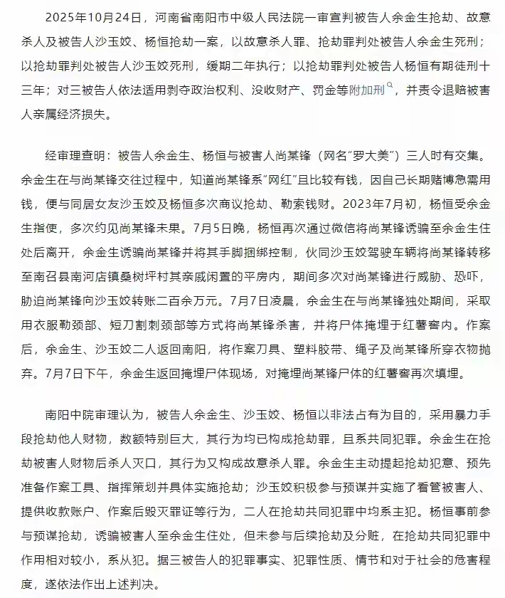 10月24日,轰动一时的网红罗大美遇害案一审开庭,主犯余金生被判死刑,沙玉姣死缓,杨恒有期徒刑13年,并处于剥夺政治权利、没收财产等附加刑。