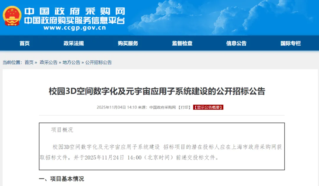 11月4日,上海市政府采购中心发布了上海大学校园3D空间数字化及元宇宙应用子系统建设的公开招标公告。