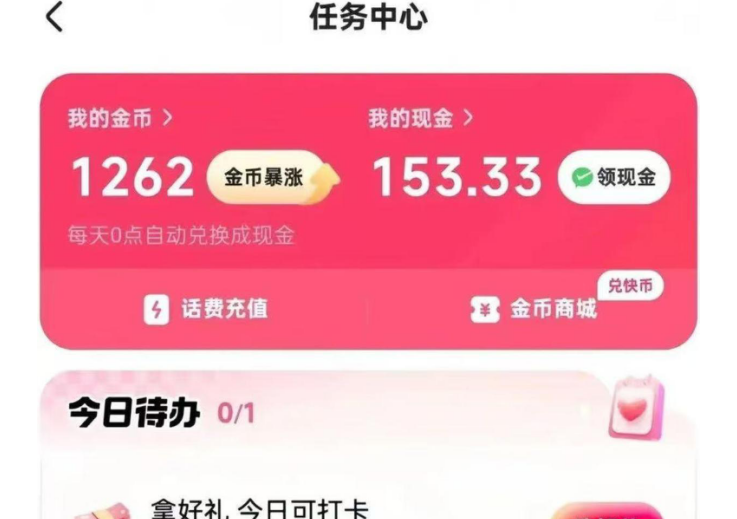 平台设立了独立的任务中心,内含多个广告观看入口。只要完成观看任务,就能获得金币奖励,不断积累后即可兑换现金。