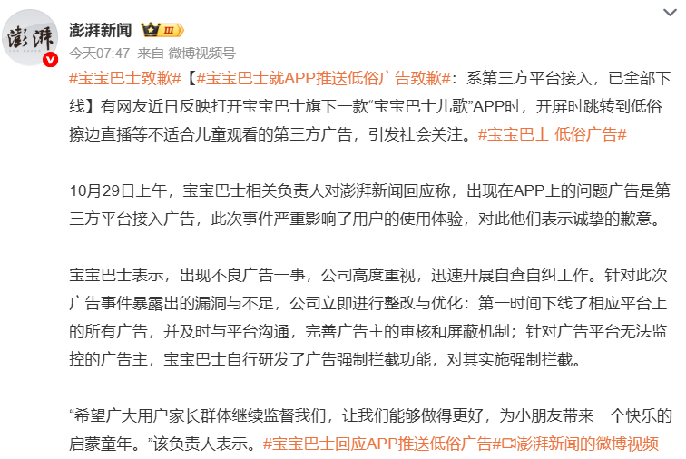 10月29日上午,宝宝巴士相关负责人终于站出来回应,称问题广告是第三方平台接入的,并对用户体验受到影响表示诚挚歉意。