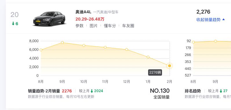 对于国内汽车市场有所了解的朋友应该都知道,奥迪A4L在最近两年的市场表现可以说是王小二过年——一年不如一年,与之形成鲜明对比的是,奥迪A6L和奥迪A3的市场表现却都还很不错,奥迪A6L在2月份卖出了7749辆,而奥迪A4L月销量只有2276辆。