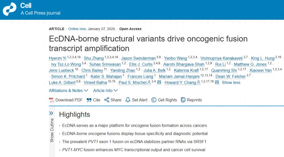 1月7日,《Cell》的研究报道“EcDNA-borne structural variants drive oncogenic fusion transcript amplification”,为我们揭开了ecDNA更深层的秘密。ecDNA不仅仅是基因的搬运工,它还是基因组结构变异(Structural Variants, SVs)的主要平台,它通过制造特定的基因融合(Gene Fusions),赋予了癌基因前所未有的稳定性,从而驱动肿瘤的恶性进展。