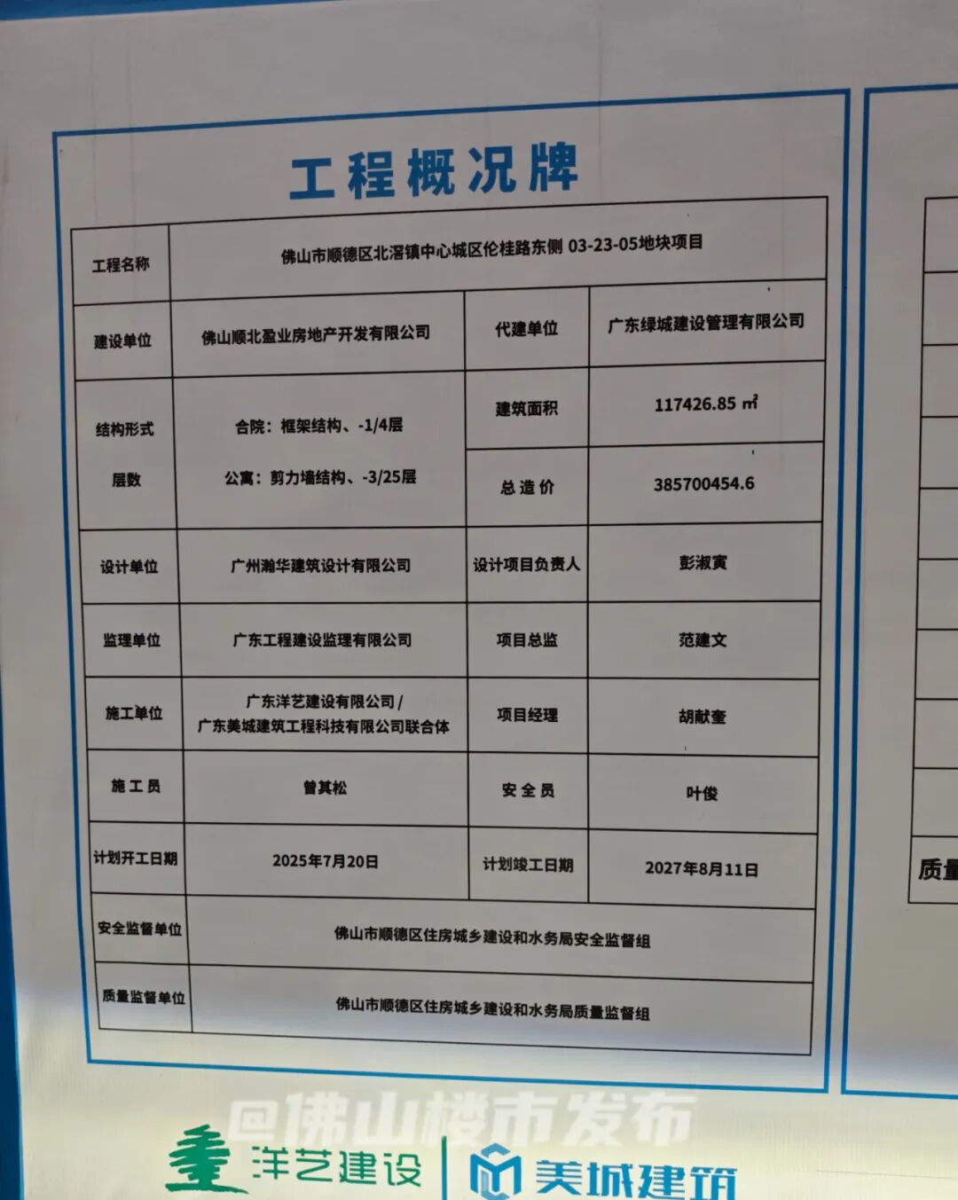 |顺北绿城·大美和院现场实拍| 佛山楼市发布摄眼尖的楼市君,还扒到了最新工程概况表。根据工程概况表,项目总建筑面积117426平,总造价超3.85亿。项目合院采用框架结构(1-4层)、人才房为剪力墙结构(3-25层),由广州瀚华建筑设计公司设计,由广东美城建筑工程科技有限公司联合体施工。开工和竣工时间也在规划图上写明白了——2025年7月20日开工,2027年8月11日竣工。