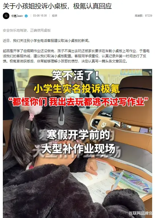 无独有偶,当“小孩姐”通过社交媒体认真建议,能否取消车辆小桌板,以免父母在车上让自己写作业时,极氪的回应同样没有停留在客服话术。他们再次真诚呼吁,希望把桌板留给零食、玩具和旅途的快乐,把卷子留在家里。这个回应,击中了无数家庭的笑点与痛点,也让人看到品牌价值观的温度。