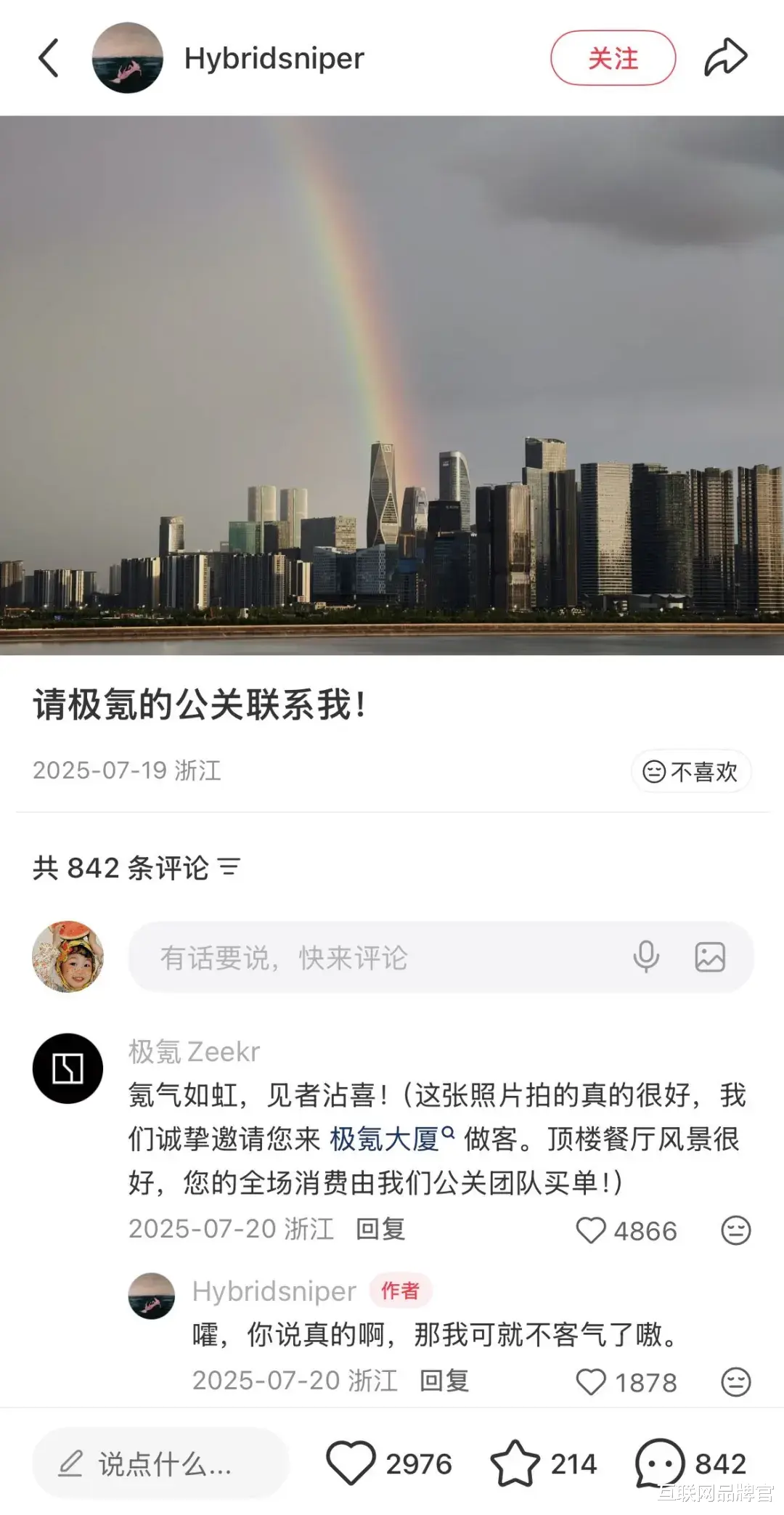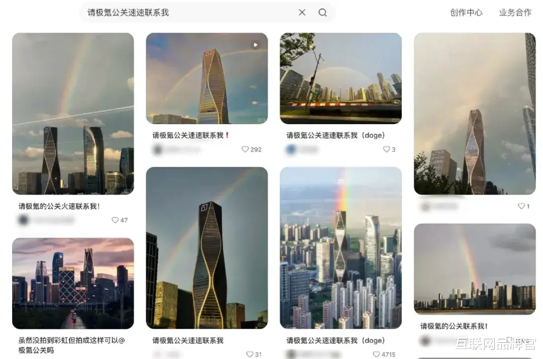 有网友拍到彩虹恰好落在极氪大厦楼顶,随手@官方。极氪没有错过这份天赐的浪漫,立刻热情回应,接住了这泼天的富贵。随后,一场网友自发拍摄、分享、@极氪的“彩虹图大赛”温馨展开。品牌与用户,在这件与车无关的小事上,共享了一份基于幸运与美好的情绪连接。