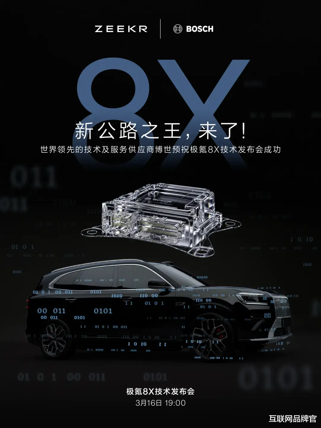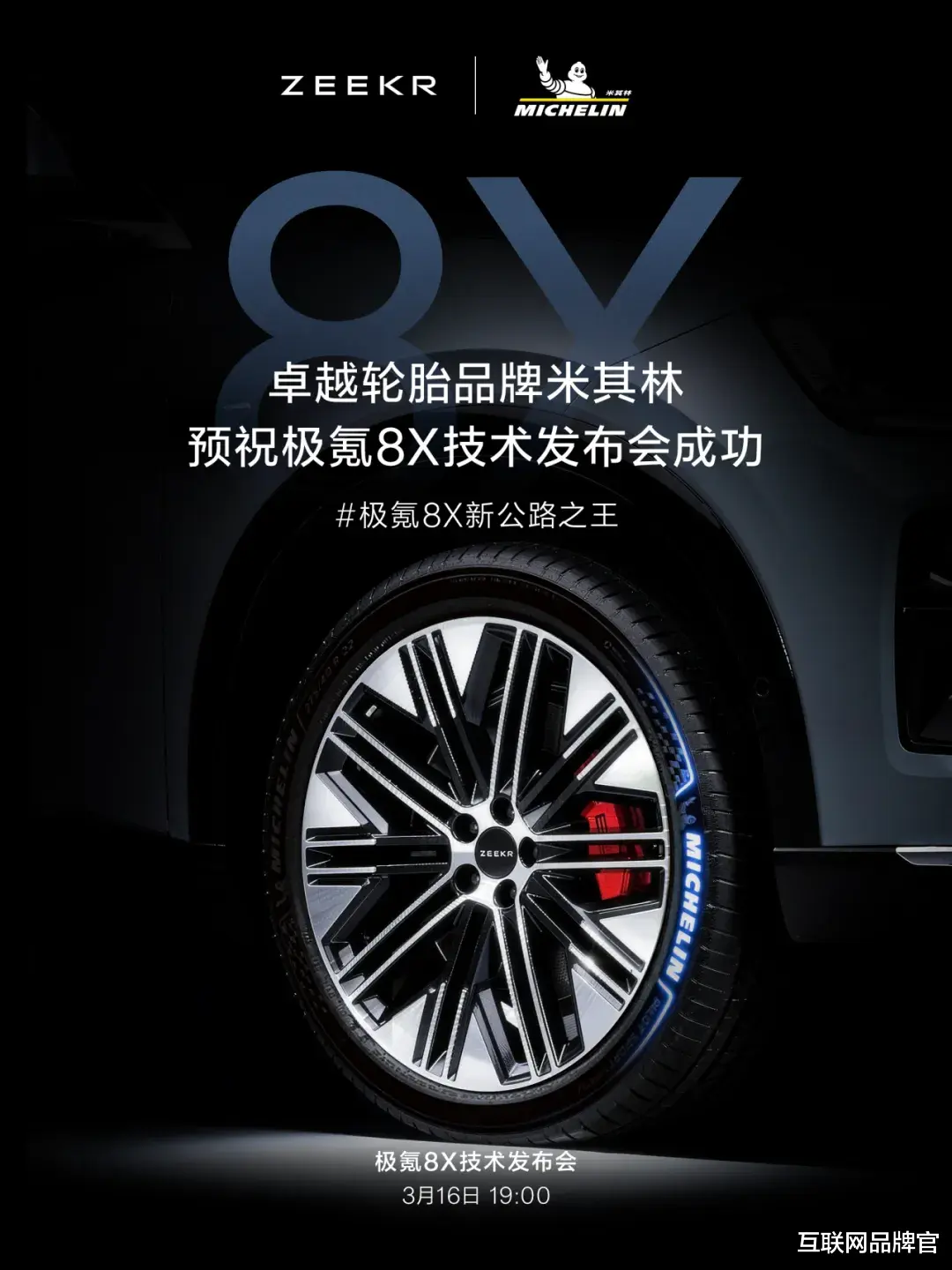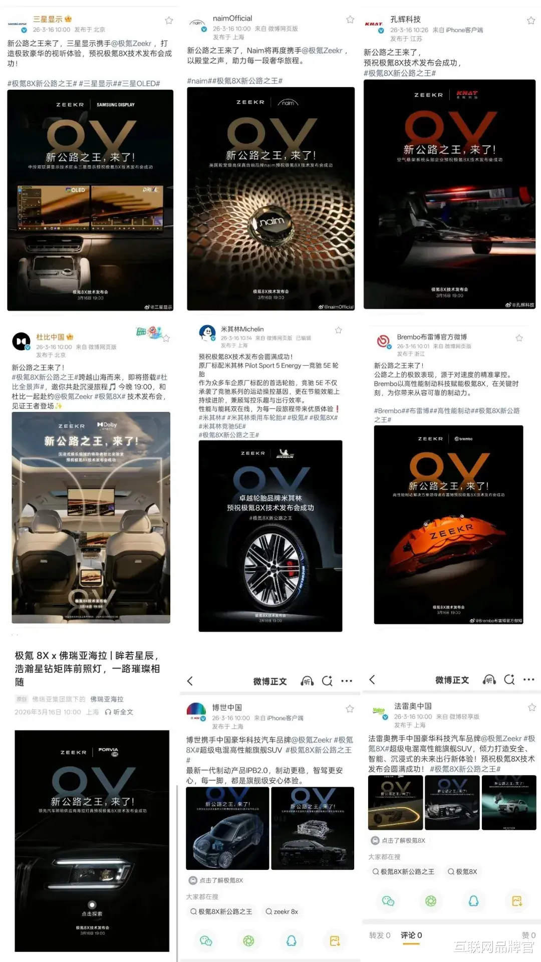 3月16日晚,极氪品牌为旗下全新高性能旗舰SUV极氪8X,举办了一场技术发布会。但有趣的是,发布会尚未开始,罕见场景上演:博世中国、米其林、布雷博、孔辉科技、三星、佛瑞亚、naim、杜比、法雷奥等十余家全球顶级供应链伙伴,竟在社交平台发起整齐划一的“祝贺接力”,为这款尚未完全亮相的中国品牌新车预热,并一致赋予其“新公路之王”的称号。