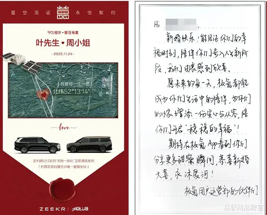 例如,有极氪车主在小红书上发帖,希望能集结一支车队作为自己的婚车。这本是一个普通的用户心愿,但极氪团队看到后,没有让它停留在评论区的一句祝福。他们主动去帮忙协调、布置,甚至还通过吉利卫星通讯系统为新人送上了专属爱情坐标祝福。