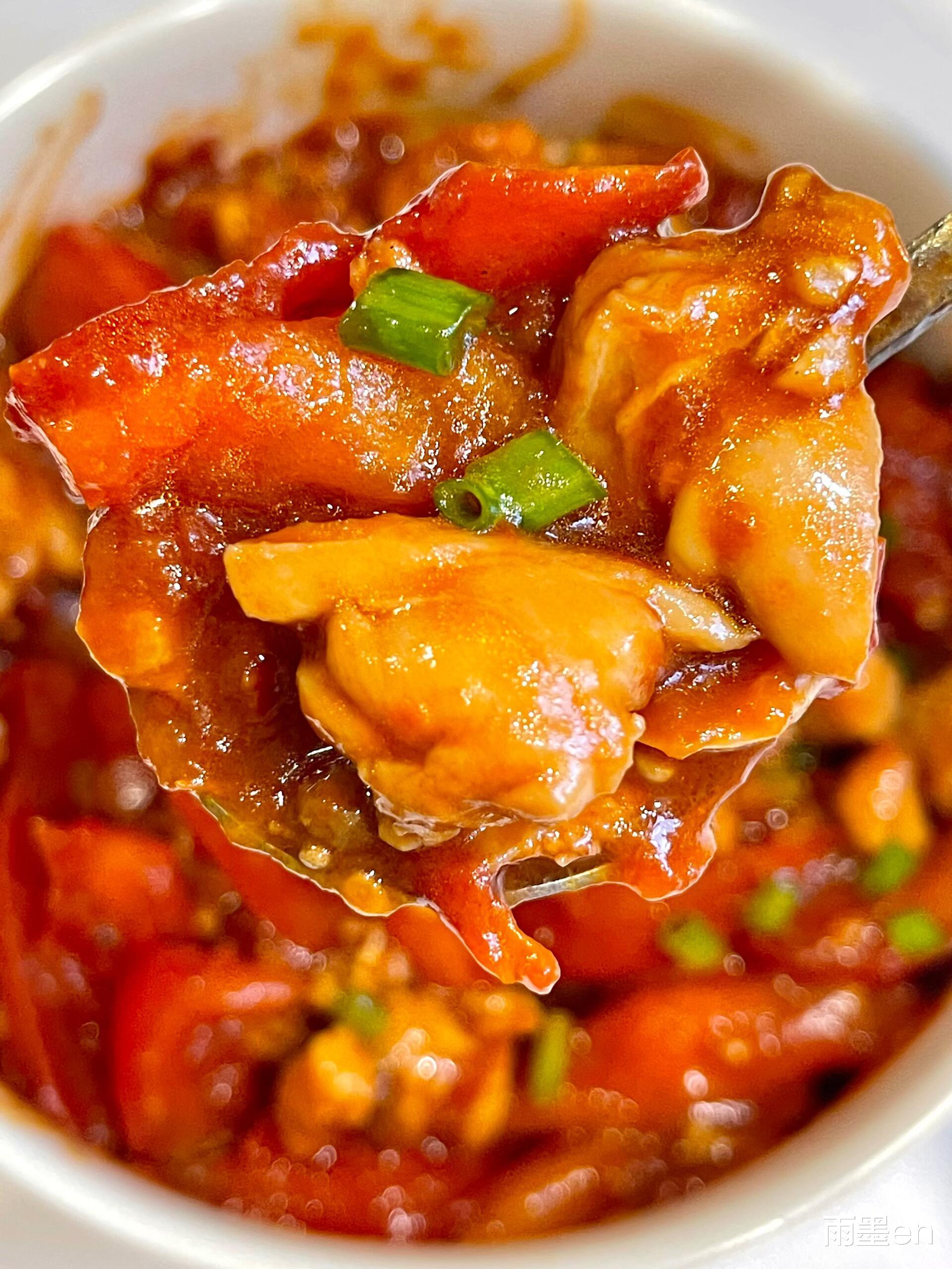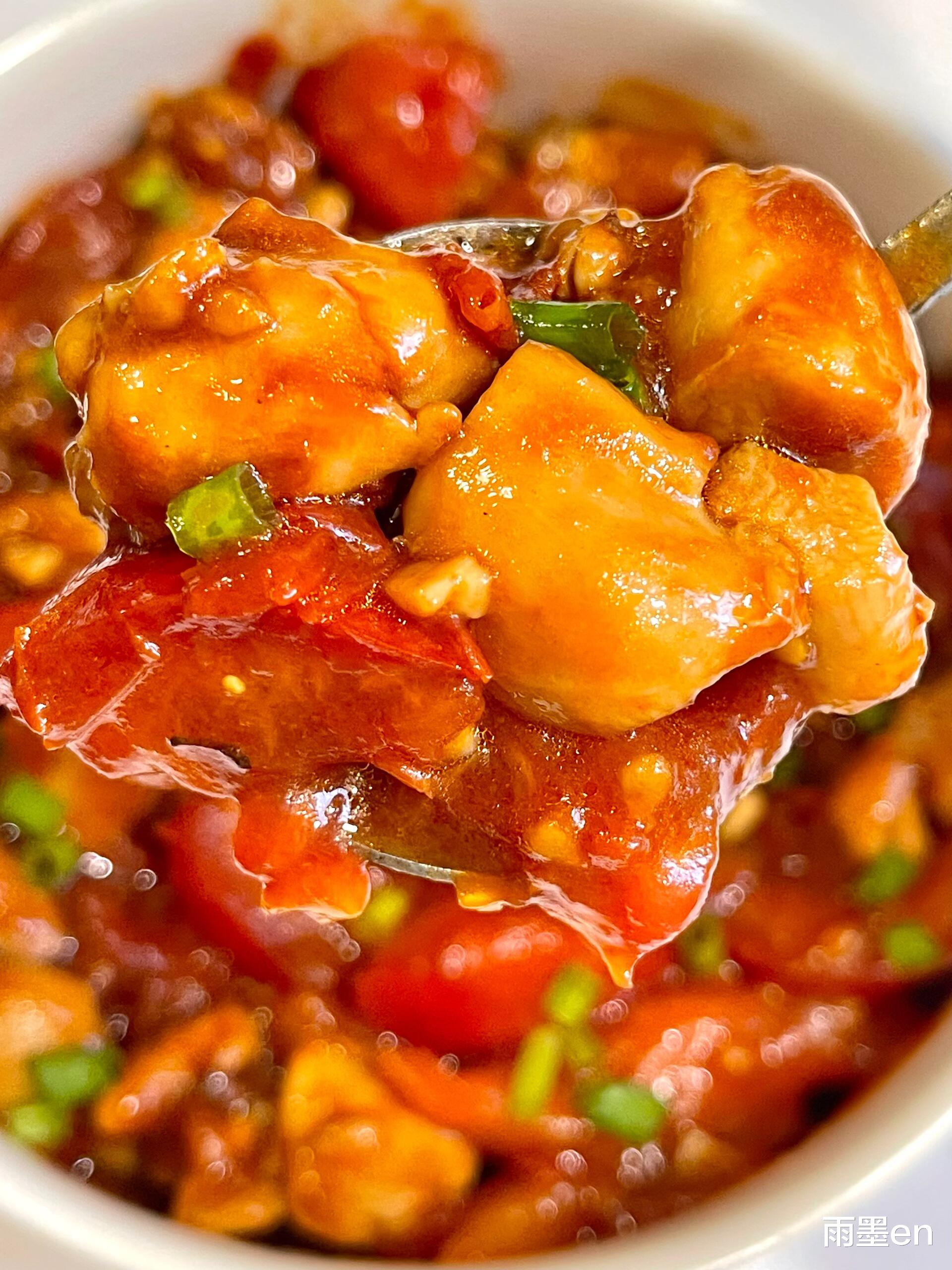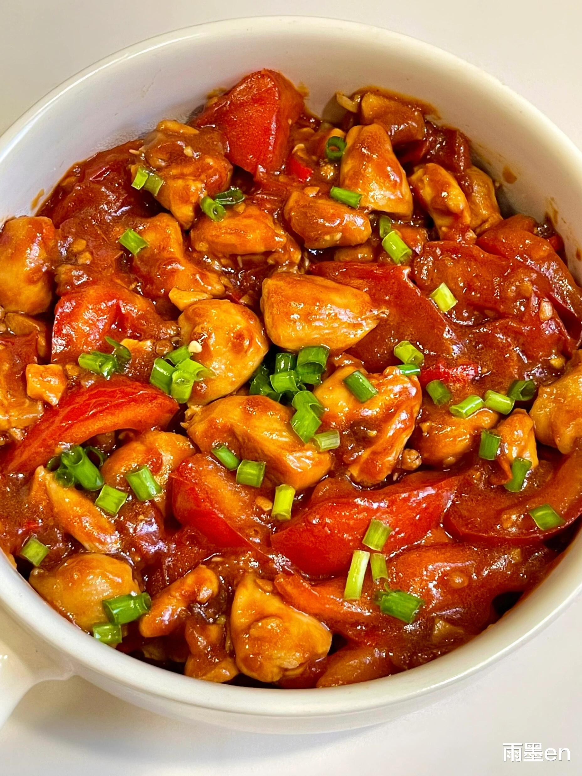 起锅倒油,油热后放入姜片、蒜末和小米辣爆香,接着加入郫县豆瓣酱炒出红油,香味瞬间就飘出来了!倒入腌制好的鸡肉,快速翻炒至表面变色,盛出备用。锅里留少许底油,放入番茄块,用铲子不停按压翻炒,直到番茄出沙变成浓汁,加1勺生抽、半勺白糖调味,白糖能中和番茄的酸味,让口感更丰富。把炒好的鸡肉倒回锅中,和番茄汁充分拌匀,沿锅边淋1勺香醋,翻炒1分钟就能出锅,最后撒上葱花,香味直冲天灵盖!