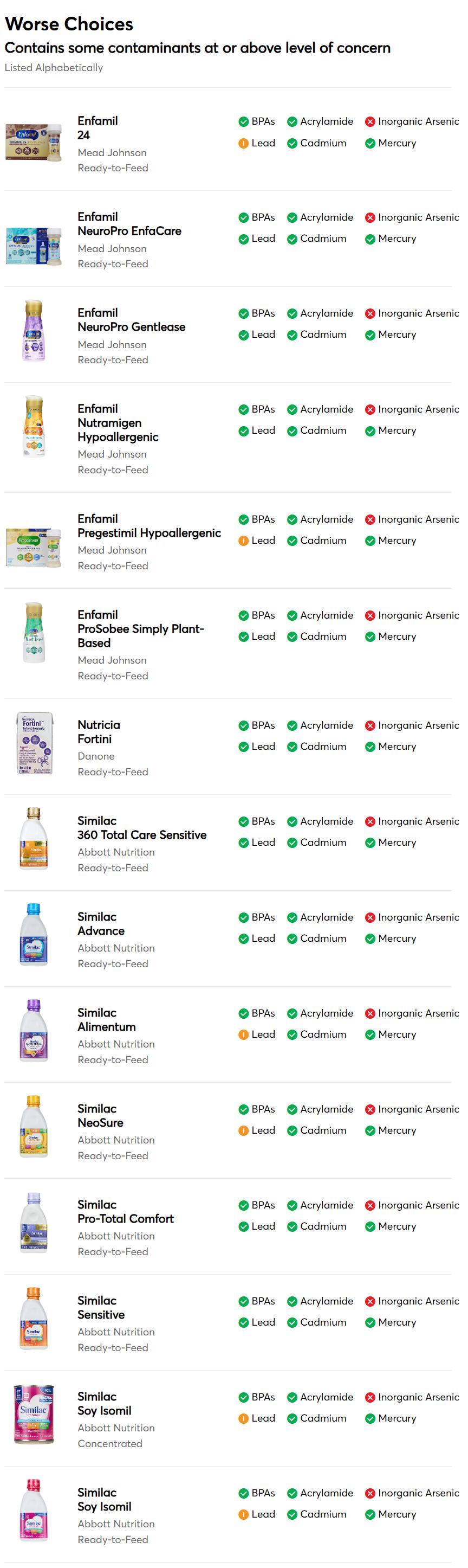 :各种有害污染物均未检测到或含量低(Not detected/low levels),或者仅个别有害物含量接近每日限值(Levels nearing daily limits);15 款较差的液态配方奶:至少含有 1 种有害污染物,其含量超过每日限值(Levels over daily limits)。11 款粉状和 15 款液态婴儿配方奶,至少含有 1 种有害污染物,且含量超过每日限值。关于其具体制造商与品牌信息,我们将另行撰文予以披露。如此安排,即便再次遭遇其中国经销商恶意误指内容不实的状况,亦不会妨碍父母了解 15 款优质配方奶粉和 8 款优质液态配方奶的相关信息。