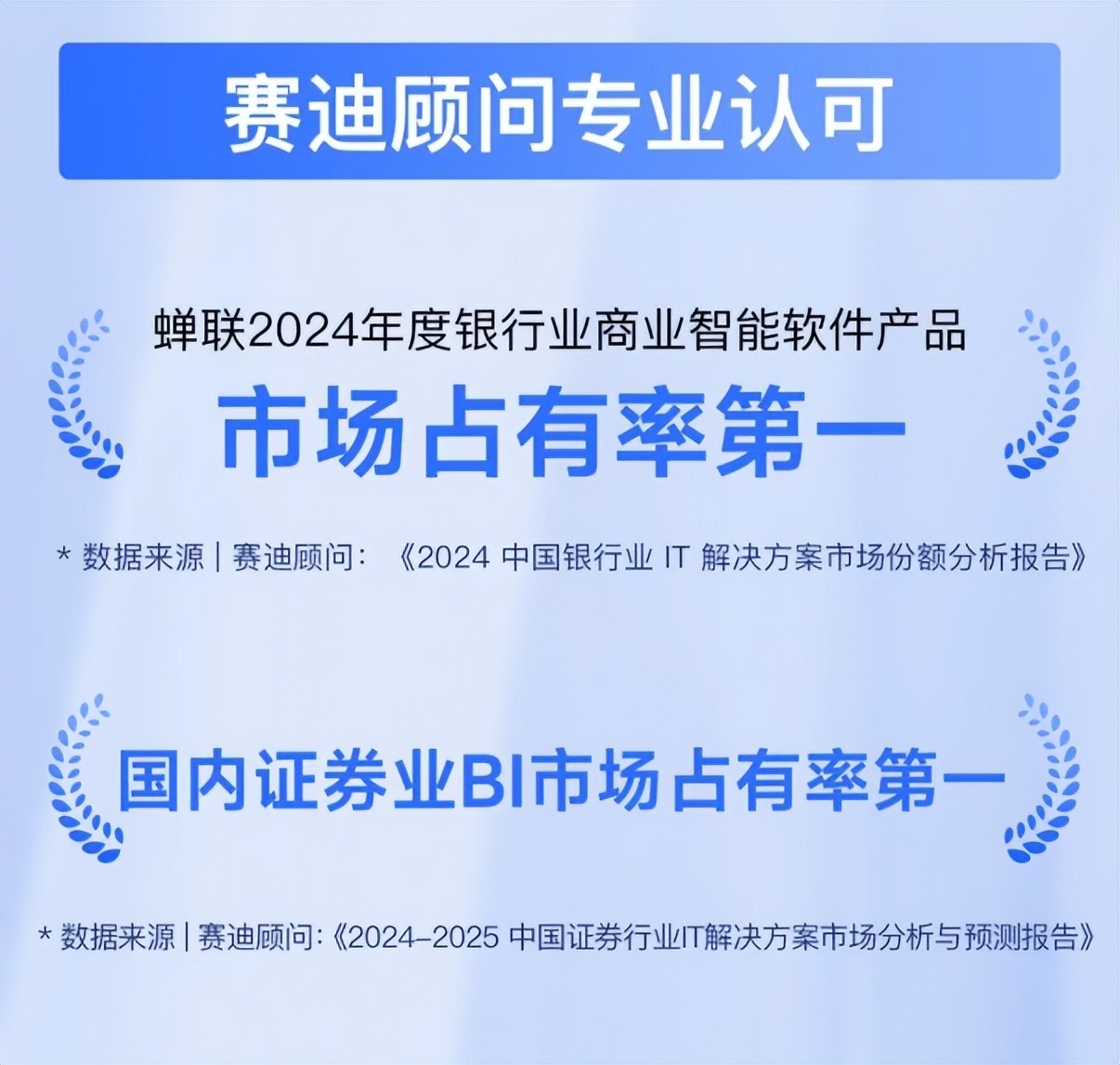 其最新发布的《2024-2025 中国证券行业 IT 解决方案市场分析与预测报告》指出,思迈特位居国内证券业 BI 厂商市场占有率第一。同时其连续多年稳居银行业商业智能软件产品市场占有率榜首,彰显了思迈特在金融 BI 市场的绝对领先优势。