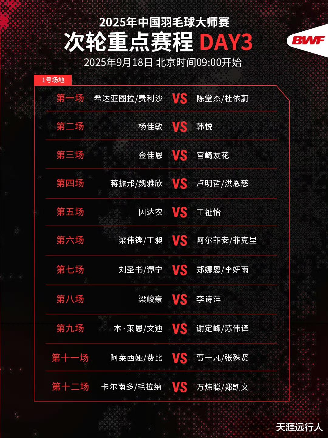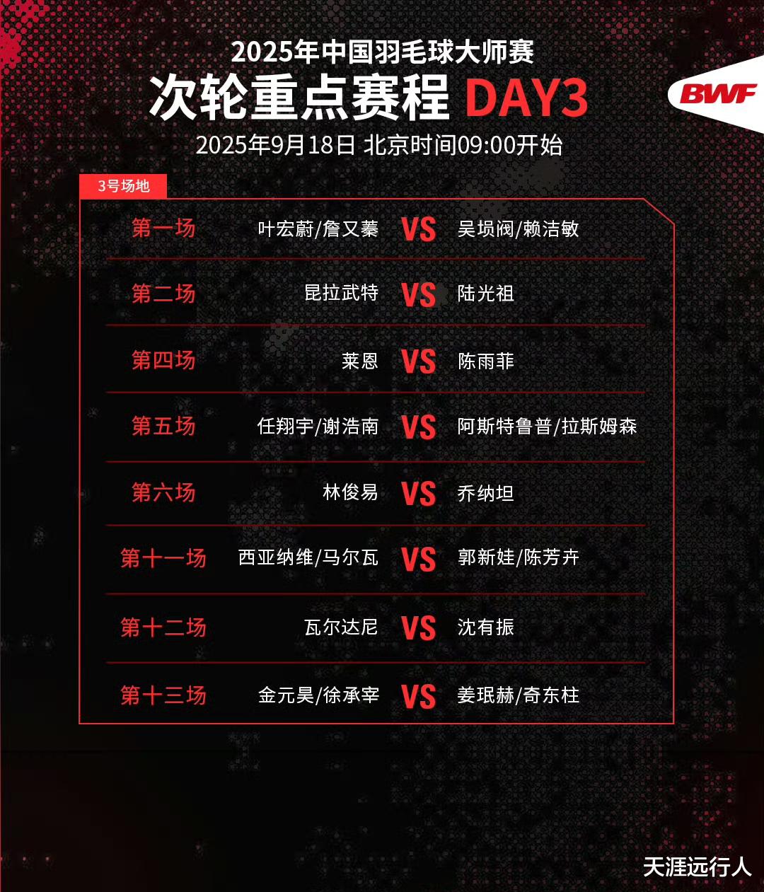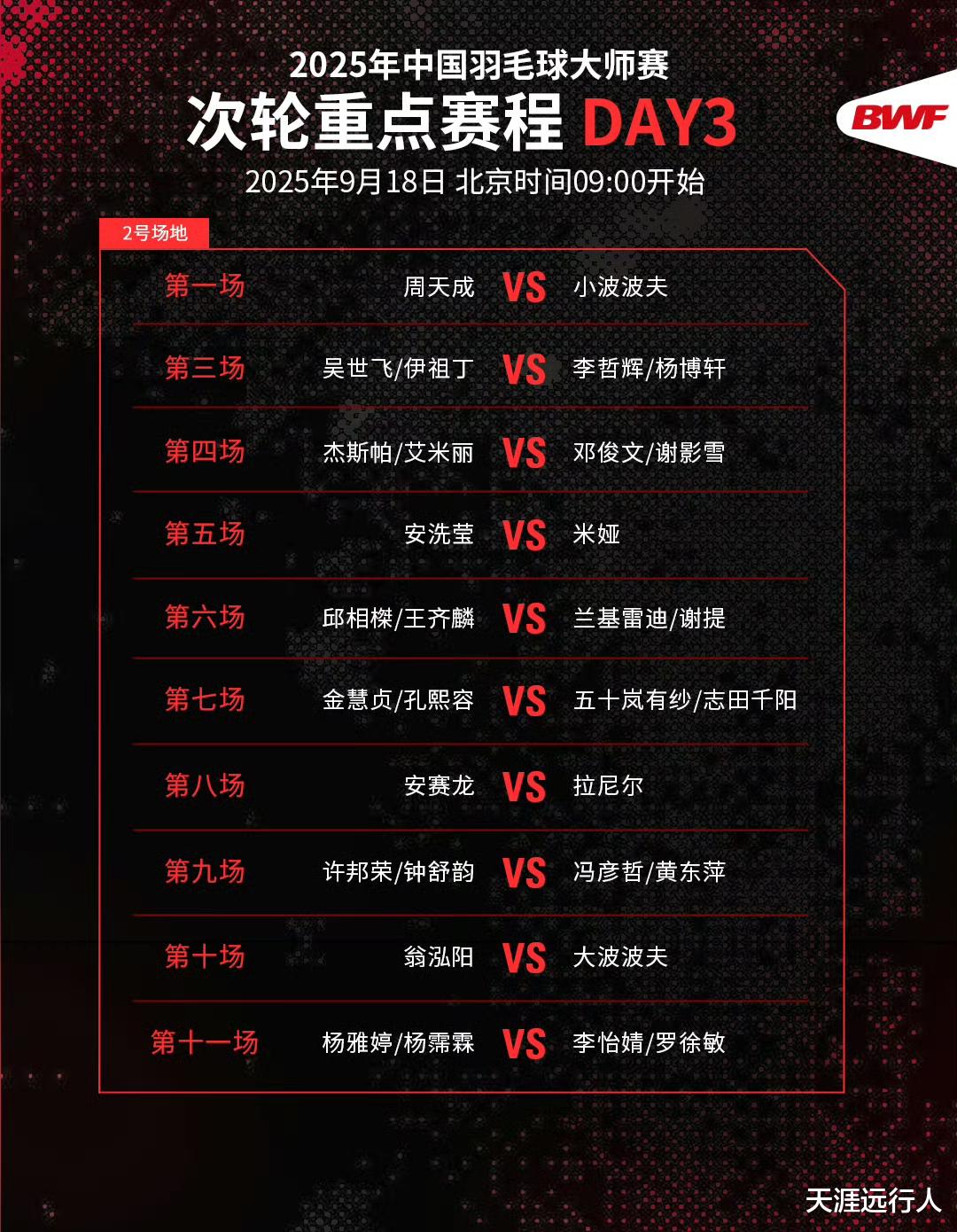 2025年中国羽毛球大师赛9月18日16进8轮次国羽重点赛程