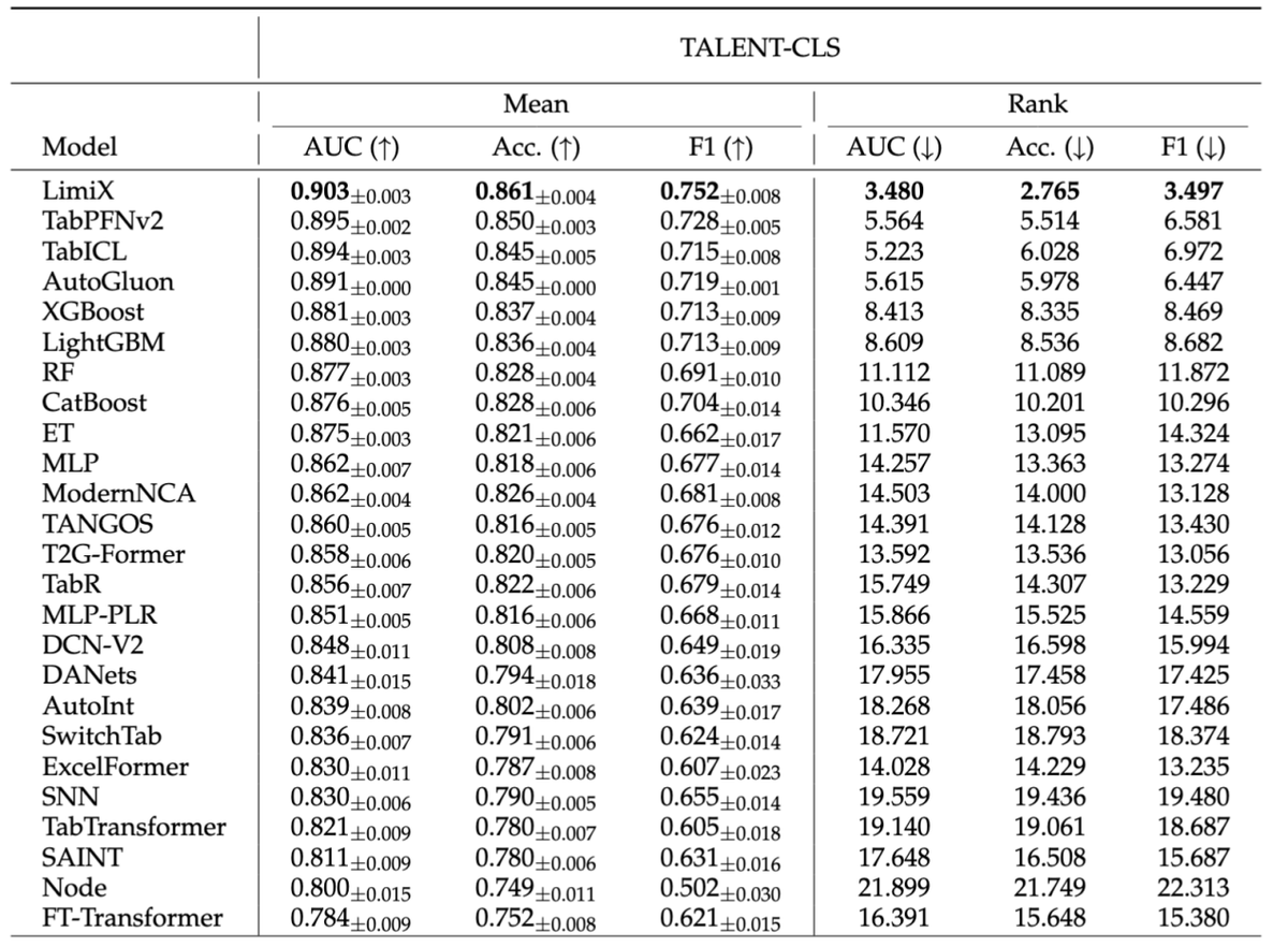 “极数”模型在评测方面,选取了各个领域的权威数据集作为Benchmark。如开源数据集Talent,它包含上百个真实数据集,是当前领域内体量最大、最具代表性的基准之一。在分类任务中,对比“极数”与24个领域内的最优模型,“极数”大模型的模型性能显著超越其他模型,在AUC、ACC、F1Score和ECE上均取得了最优。