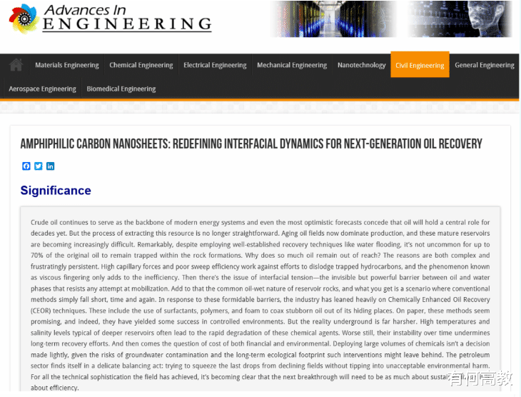 相关成果被国际著名科技平台Advances in Engineering遴选为对科学和工程研究作出显著贡献的重要科学论文。该平台聚焦材料、化学、电子、机械、生物医学、应用物理及通用工程等领域,其中仅有千分之一的论文能够入选,其含金量不言而喻。因此,西南石大这样研究也得到“研究远超出石油开采的应用范围......为其他行业的应用开辟了令人着迷的可能性。”的高度评价。不仅解决了特定的工业挑战,也将为产生广泛影响的材料创新奠定坚实的基础。