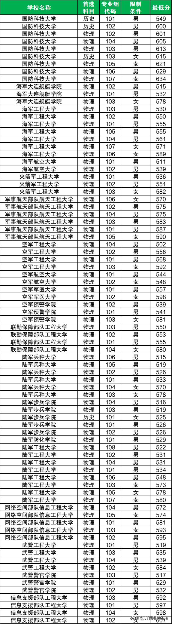 而2025年在陕西招生的军校一共有19所,包含国防科技大学、陆军工程大学、海军工程大学、军事航天部队航天工程大学、陆军兵种大学等,各校分数线门槛要求各有差异,但整体在502分及以上。