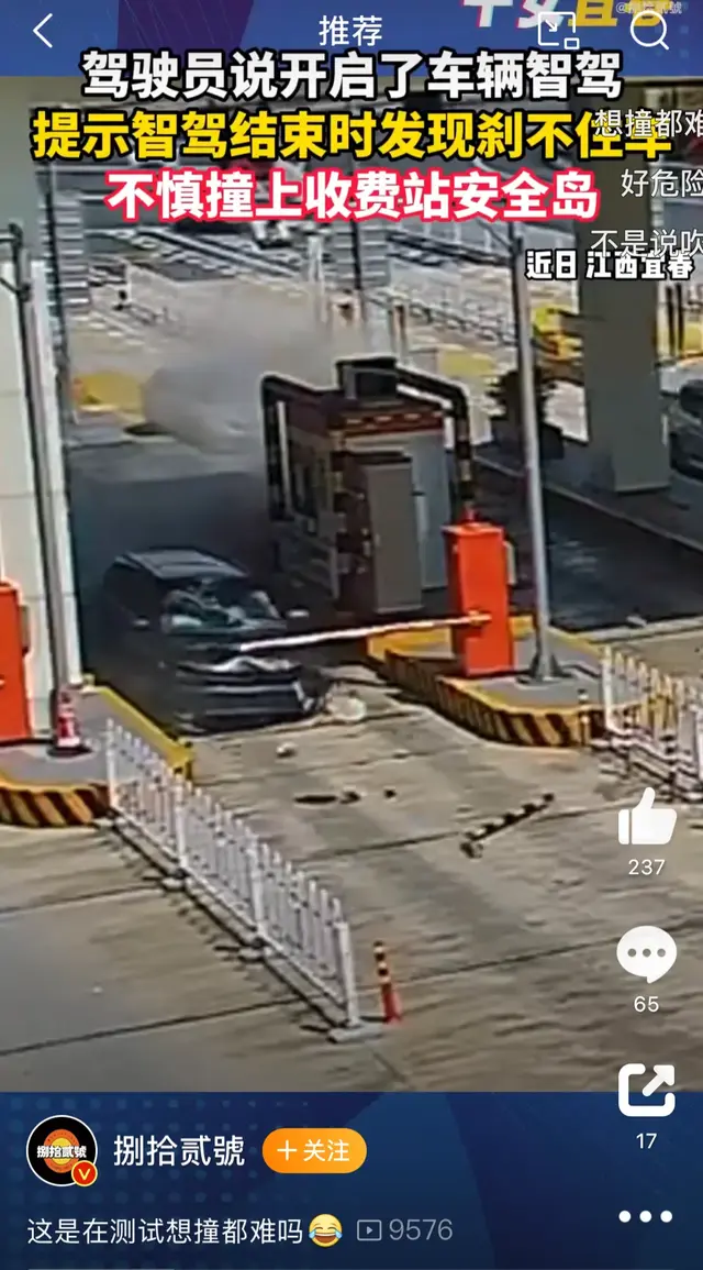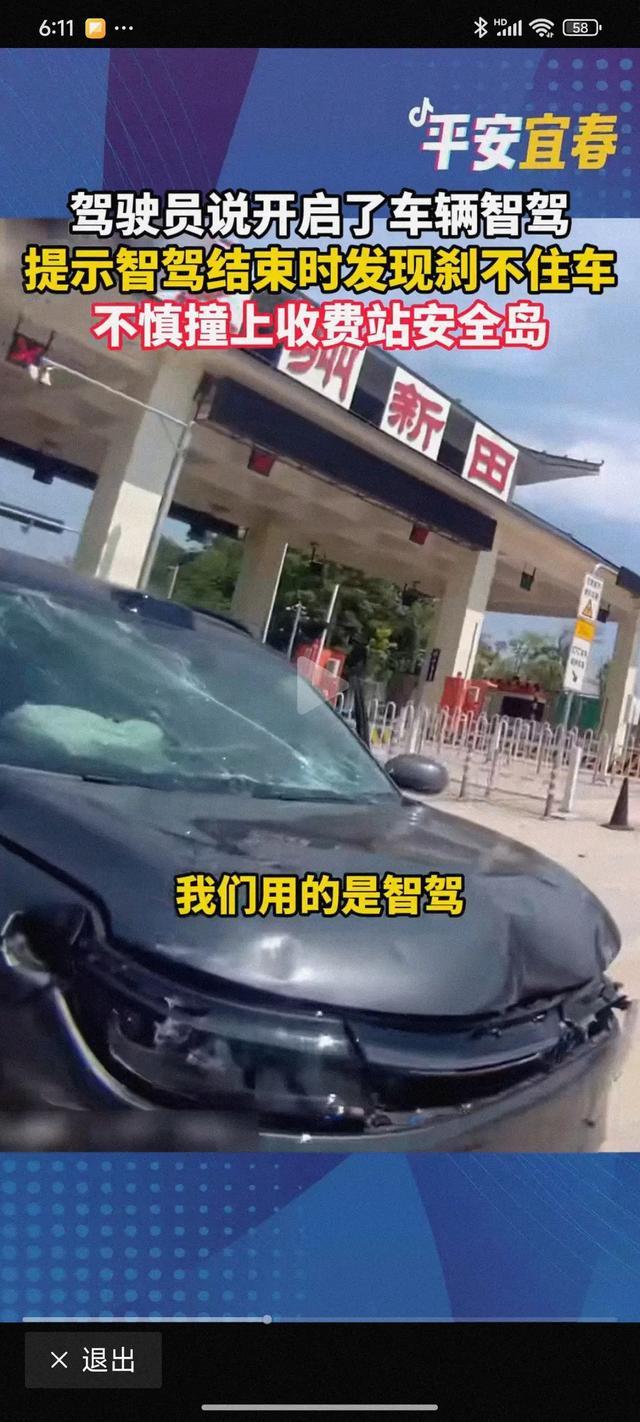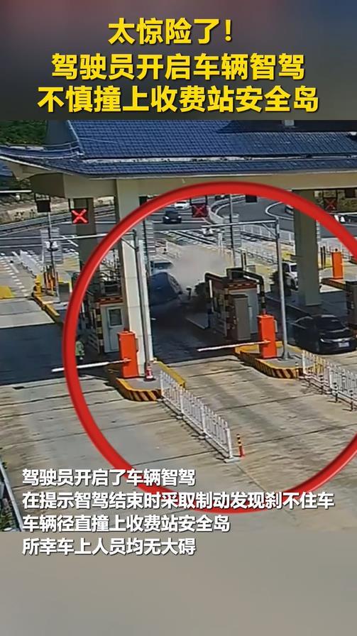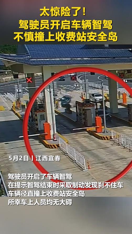 5月2日,江西宜春,一女司机高速开启了车辆智驾,在过收费站提示智驾结束时采取制动发现刹不住车,车辆径直撞上收费站安全岛,所幸车上人员均无大碍。