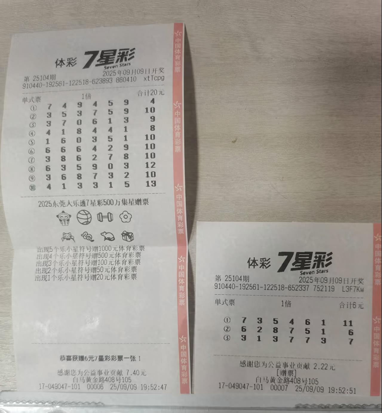 玩彩票玩了二十多年,风里来雨里去,坚持不懈,风雨无阻,一共为福利和体育事业贡献了几十万,回报的是一堆堆的废纸。期间中的最大的奖是双色球五加一,中了三千元。我记得那期开奖号码是11,15,17,18,20,30+16,而我机选的一注号码是09,11,15,17,18,20+16,与一等奖差之毫厘、谬以千里,关键我自选的其它注数中都有我最看好的30号,偏偏我机选这注号码没有30号。唉,都是命啊,这辈子看来再难突破三千元的奖了。今年买彩票已大大减少。不过想到“多买少买多少要买,早中晚中早晚要中”这句名言,心中又痒痒地要去买几注,不买有时有些不舒服。最近体彩在搞活动,这不9月9日我又买了20元的七星彩。当天运气似乎不错,买了20元居然赠送了6元彩票,另外还中了一个乐小星(中了活动奖20元),等于没花钱白嫖了26元彩票。今天我把我那日白嫖的26元彩票发布在这里晒一晒,给朋友们看一看,如果我坚持下去看看我能中大奖吗?要是中了500万,请朋友们喝酒哈!