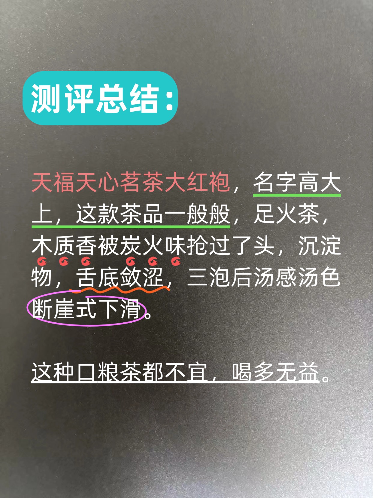 天福天心茗茶大红袍,名字高大上,这款茶品一般般,足火茶,木质香被炭火味抢过了头,沉淀物,舌底敛涩,三泡后汤感汤色断崖式下滑。这种口粮茶都不宜,喝多无益。
