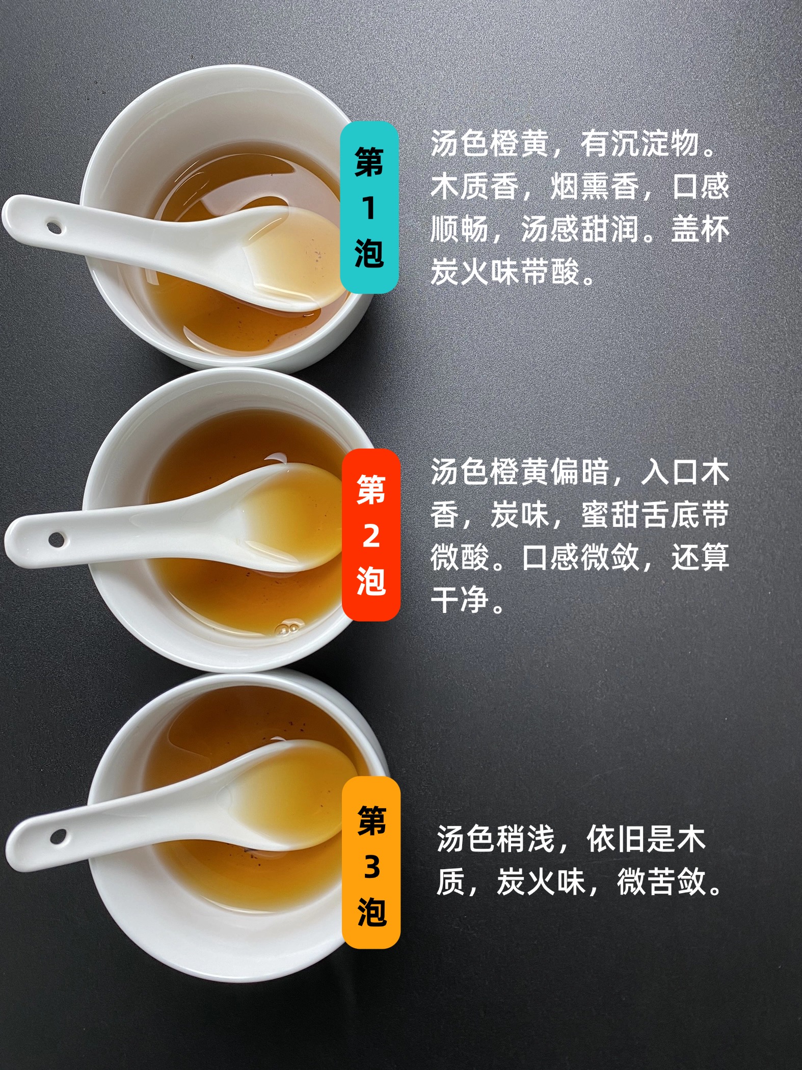 第一泡,汤色橙黄,有沉淀物。木质香,烟熏香,口感顺畅,汤感甜润。盖杯炭火味带酸。