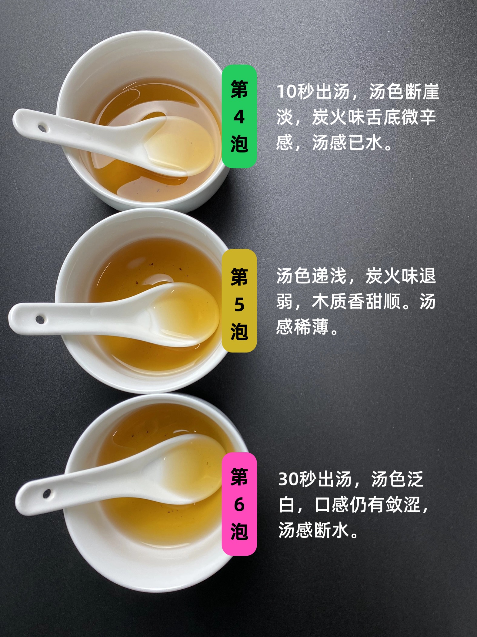 第四泡,10秒出汤,汤色断崖淡,炭火味舌底微辛感,汤感已水。