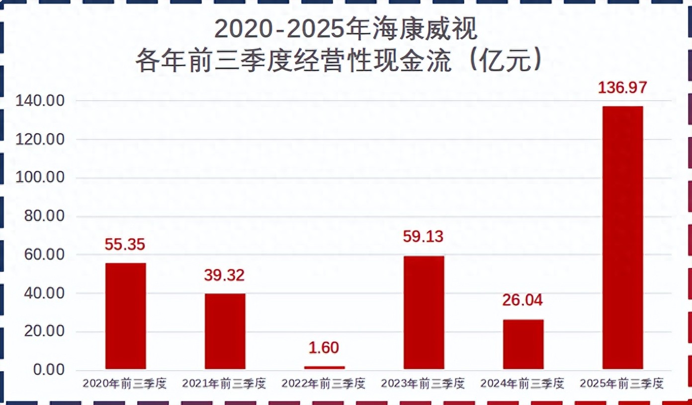 除此之外,2025年前三季度海康威视经营性现金流净额高达136.97亿元,对比去年同期的26.04亿元,增长了426.06%。