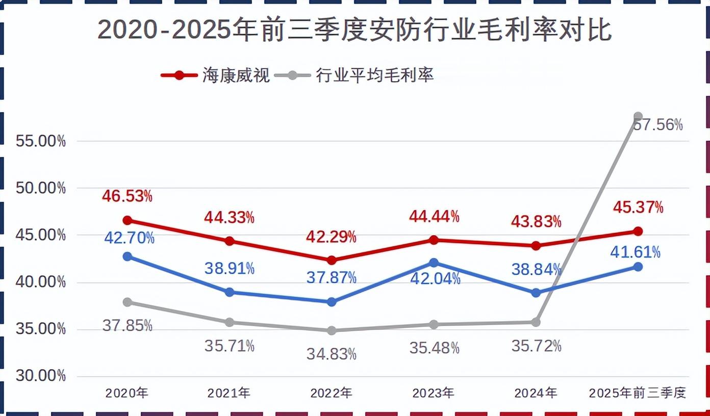 2020年至2025年前三季度,海康威视平均为44%的毛利率始终高于大华股份这个直接竞争者(平均毛利率约为40%),而二者的毛利率也始终高于行业平均水平(除了2025年第三季度)。