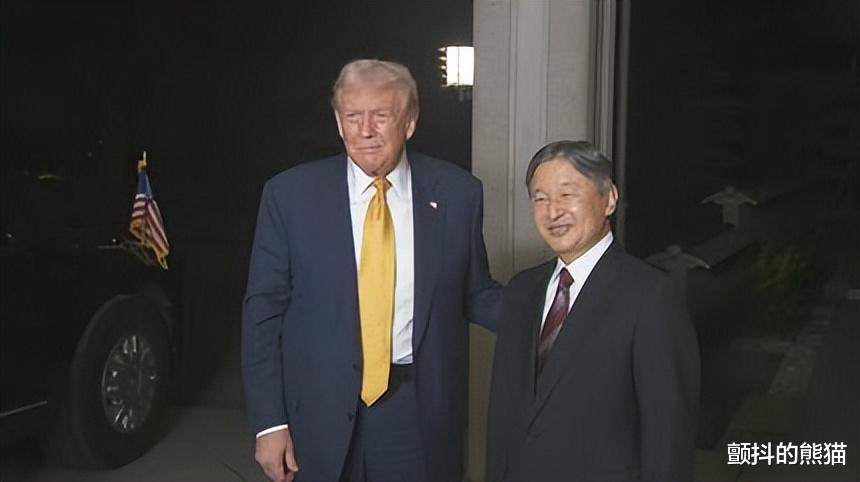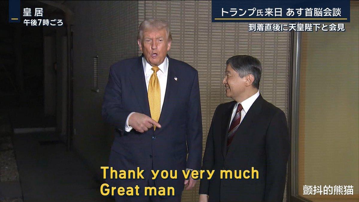 “从抵达御所的专车下车时,特朗普试图扣上西装钮扣却未能成功,最终选择放弃。虽然在记者会期间和会后握手时钮扣都已扣上,但最初与天皇致意时却是敞着西装。此外,当会谈结束与天皇步出御所时,他当着媒体面多次指向身旁的天皇,连声说‘真是个了不起的人物’。”