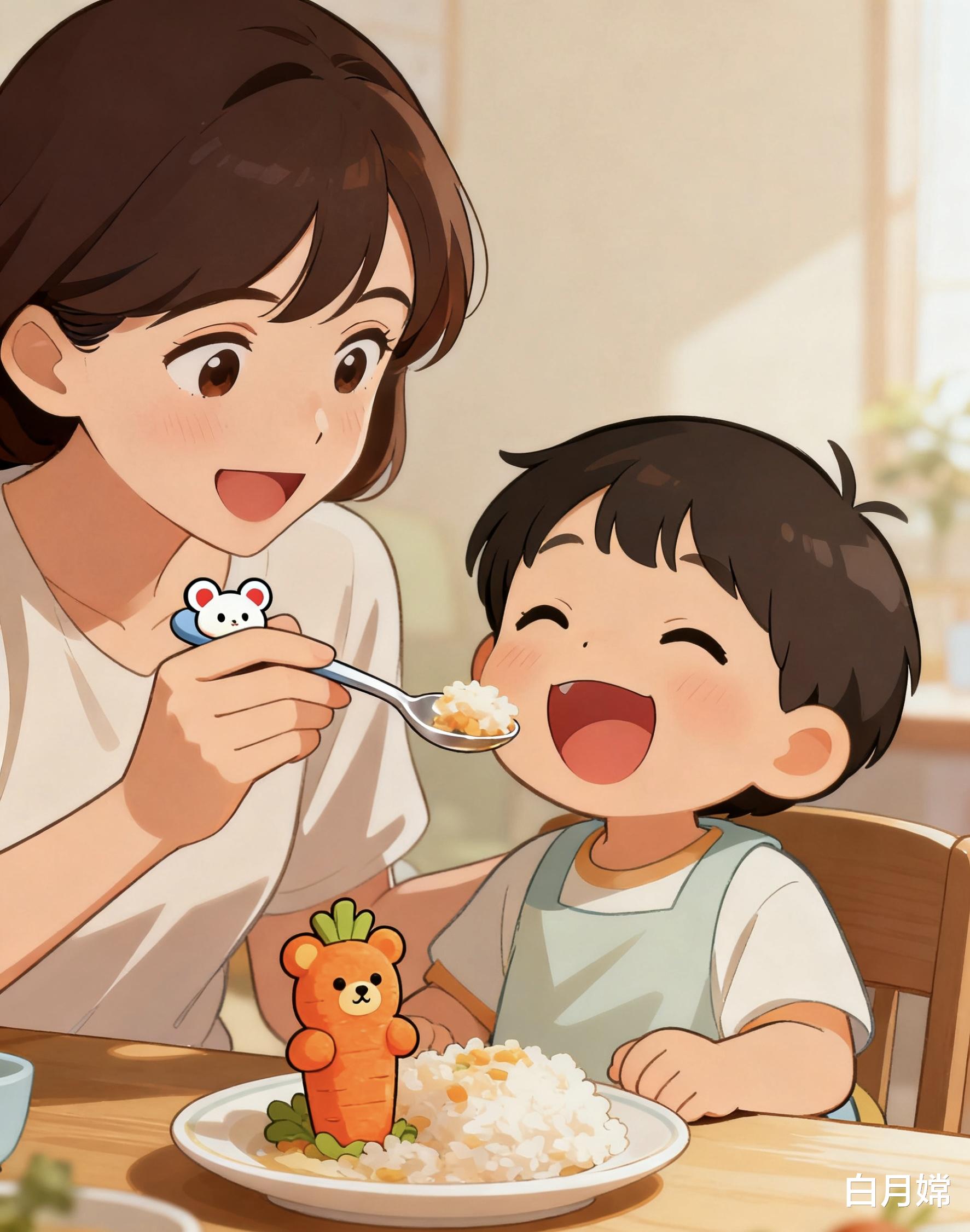 1. 餐具选“能玩的”:给娃用带卡通耳朵的勺子,吃饭时说“小兔子要跳进宝宝嘴巴里啦”,我家娃原来一口蔬菜不碰,现在会主动追着勺子要“喂小兔子”;