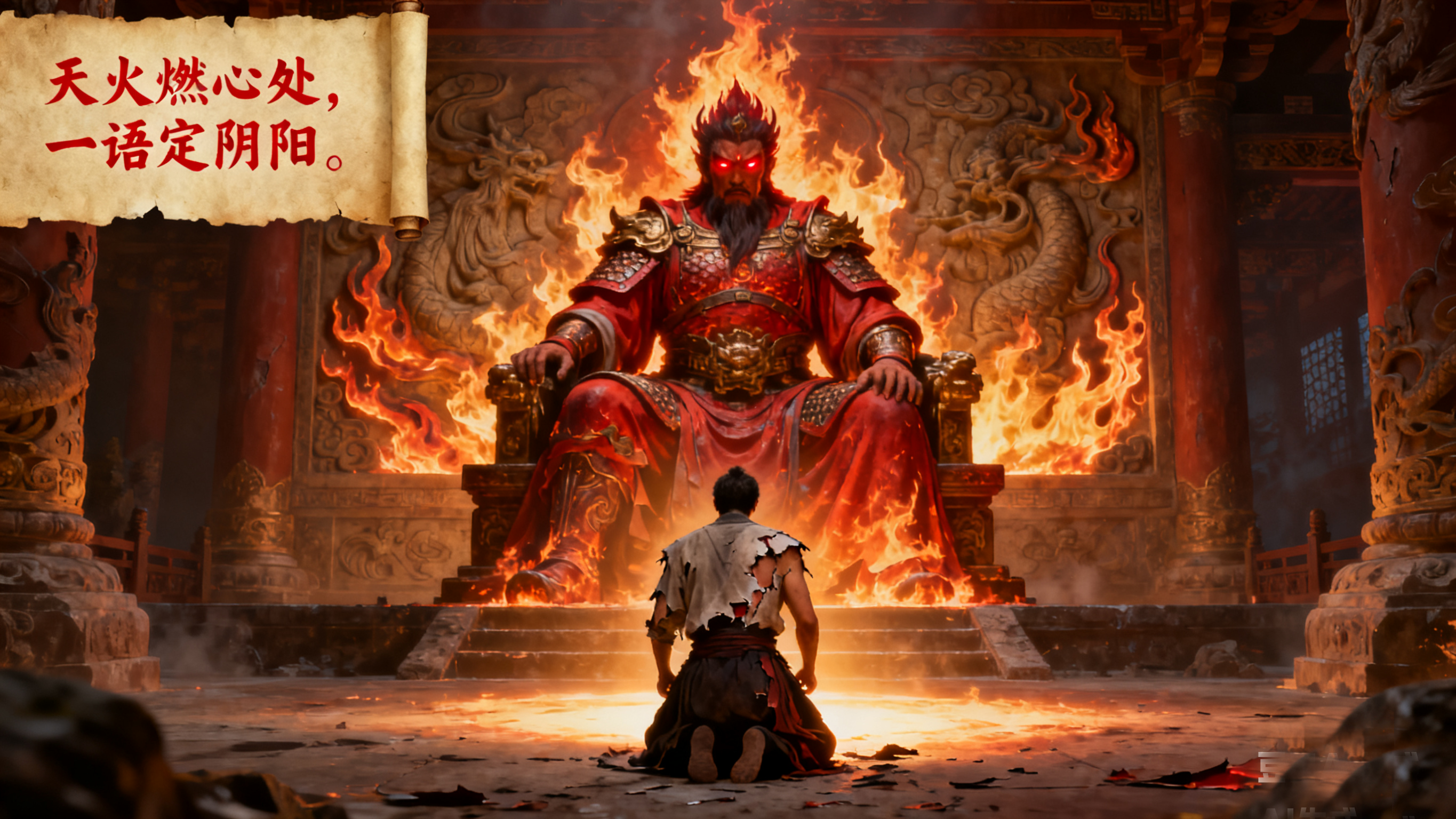 忘川之北,大海之底,沃燋石下。那里无日无月,无风无声,只有潮涌似哭,仿佛无数亡魂在海底低泣。那哭声中,火光隐隐,如血流不止。在这幽暗的深处,耸立着一座赤焰之殿——第七殿,热恼大地狱。