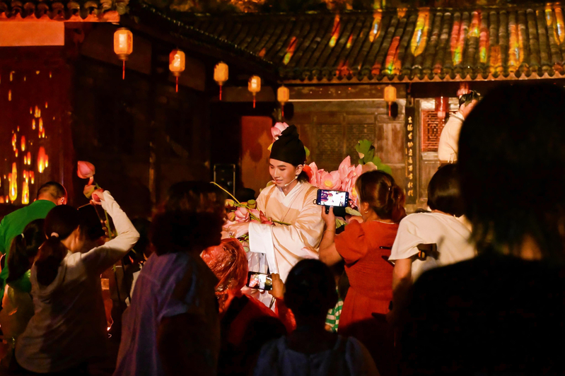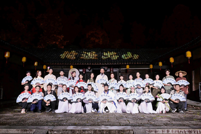 而实际效果远远超出他们的预想。在最终选定的演出场地刘基故居里,当灯光设备把文成标志性旅游景点百丈漈瀑布的影像投射到现场时,画面中的瀑布从屋后山体流到故居屋顶,再顺着屋檐墙壁淌到作为主舞台的院子地面,正好契合了百丈漈三漈三折的最大特点,呈现出室内舞台无法达到的惊艳效果。