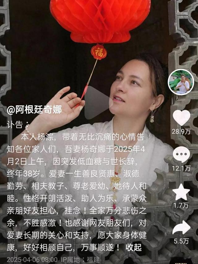 4月6日网红“阿根廷奇娜”的丈夫杨淙发布讣告,自己的妻子杨奇娜在2025年4月2日因低血糖去世了。消息发布后,引起了无数网友的惋惜,杨淙和妻子杨奇娜这对跨国婚姻,让无数人为之感动。