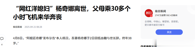( 信息来源:极目新闻 2025年04月21日 —— “网红洋媳妇”杨奇娜离世,父母乘30多个小时飞机来华奔丧 )