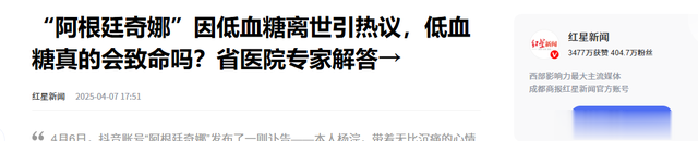 ( 信息来源:红星新闻 2025年04月07日 —— “阿根廷奇娜”因低血糖离世引热议,低血糖真的会致命吗?省医院专家解答→ )