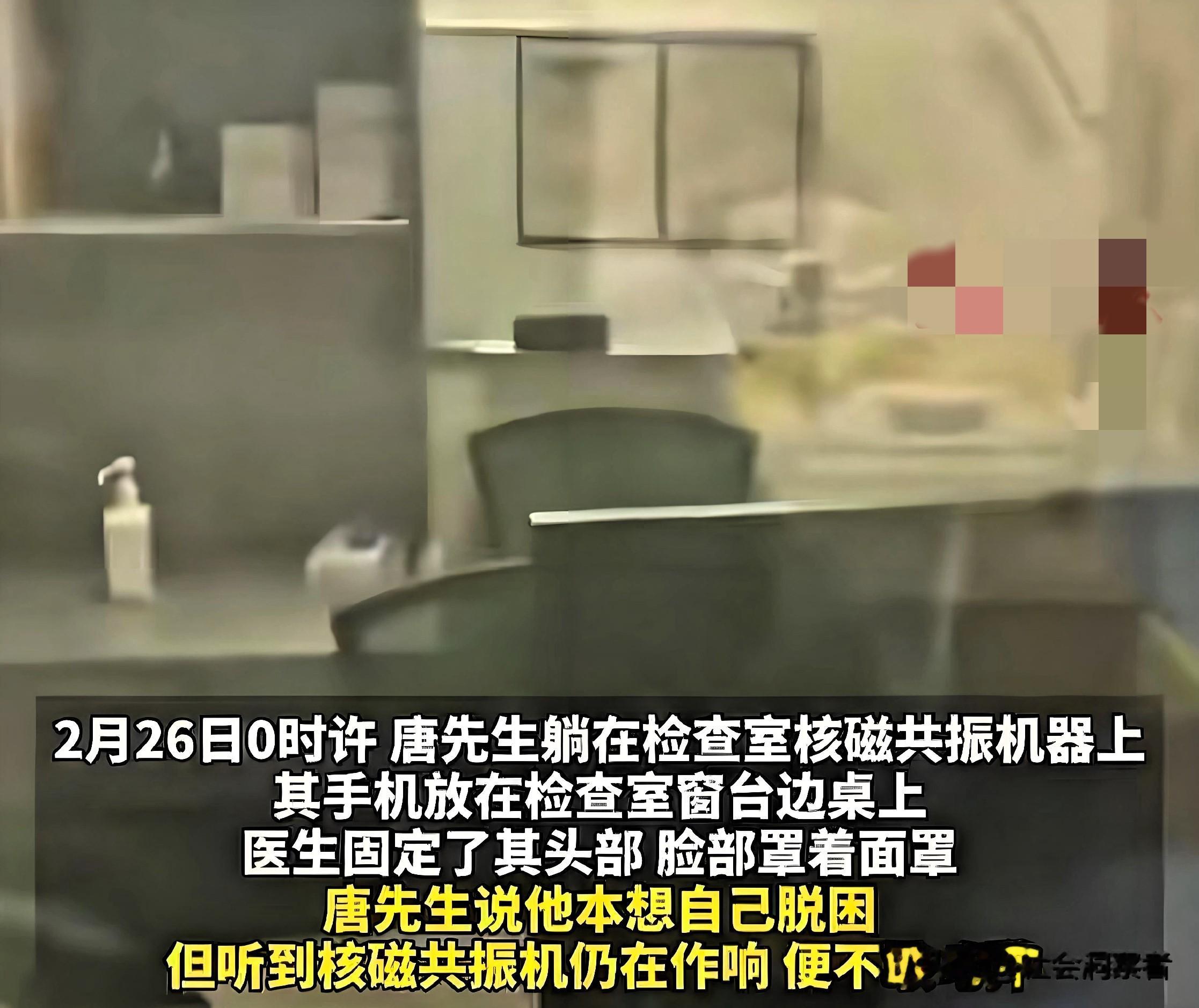 2月26日凌晨,因颈椎不适的唐先生,在武汉同济医院汉口院区2号核磁室接受检查。医生将他头部固定、戴好面罩后便匆匆离开,留下唐先生独自躺在机器上。本以为十几分钟就能结束的检查,却迟迟不见医护返回。半小时后,察觉不对的唐先生开始大声呼救,“怎么还没做完”“有人吗”“医生在不在”,可回应他的只有机器持续的嗡鸣。