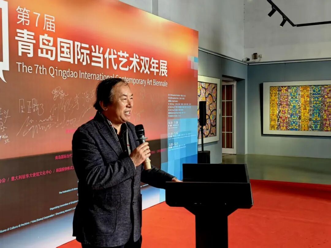 启幕仪式上,山东省美术家协会油画艺委会副主任刘青砚教授做了热情洋溢的发言。从学术角度,阐述了自己对本届参展作品,以及对在不同文化背景下,艺术家的创作形式、美学取向、审美诉求所呈现出的独特立场和深邃思想的观察思考。包括东方的写意精神和西方美学的表现观念,个体的细腻情感与时代宏大叙事的交汇、碰撞、融合。