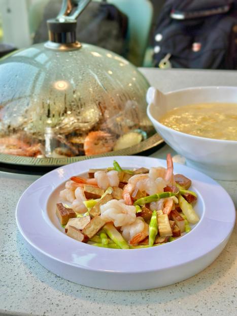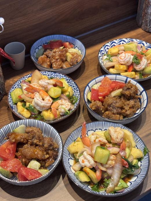 疙瘩汤超大份,南方疙瘩汤里边有芋头排骨加大虾。菠萝肉酸酸甜甜的,最爱的还是菠萝虾,之前吃过潮汕生腌,里边的汤汁和这个味道一样,很上头。