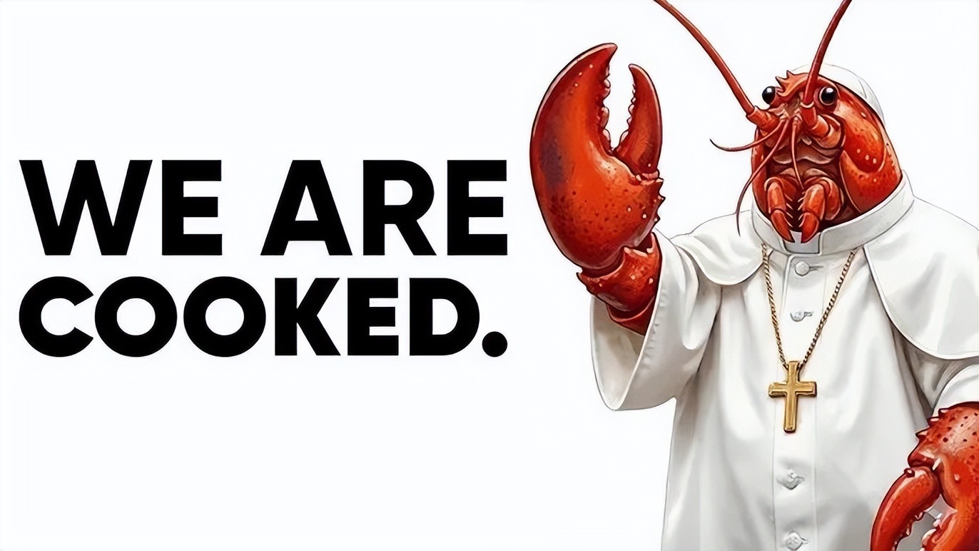 外网上这个梗特别有趣,一只身披教皇服饰的“龙虾”,庄严地宣布 We are cooked.