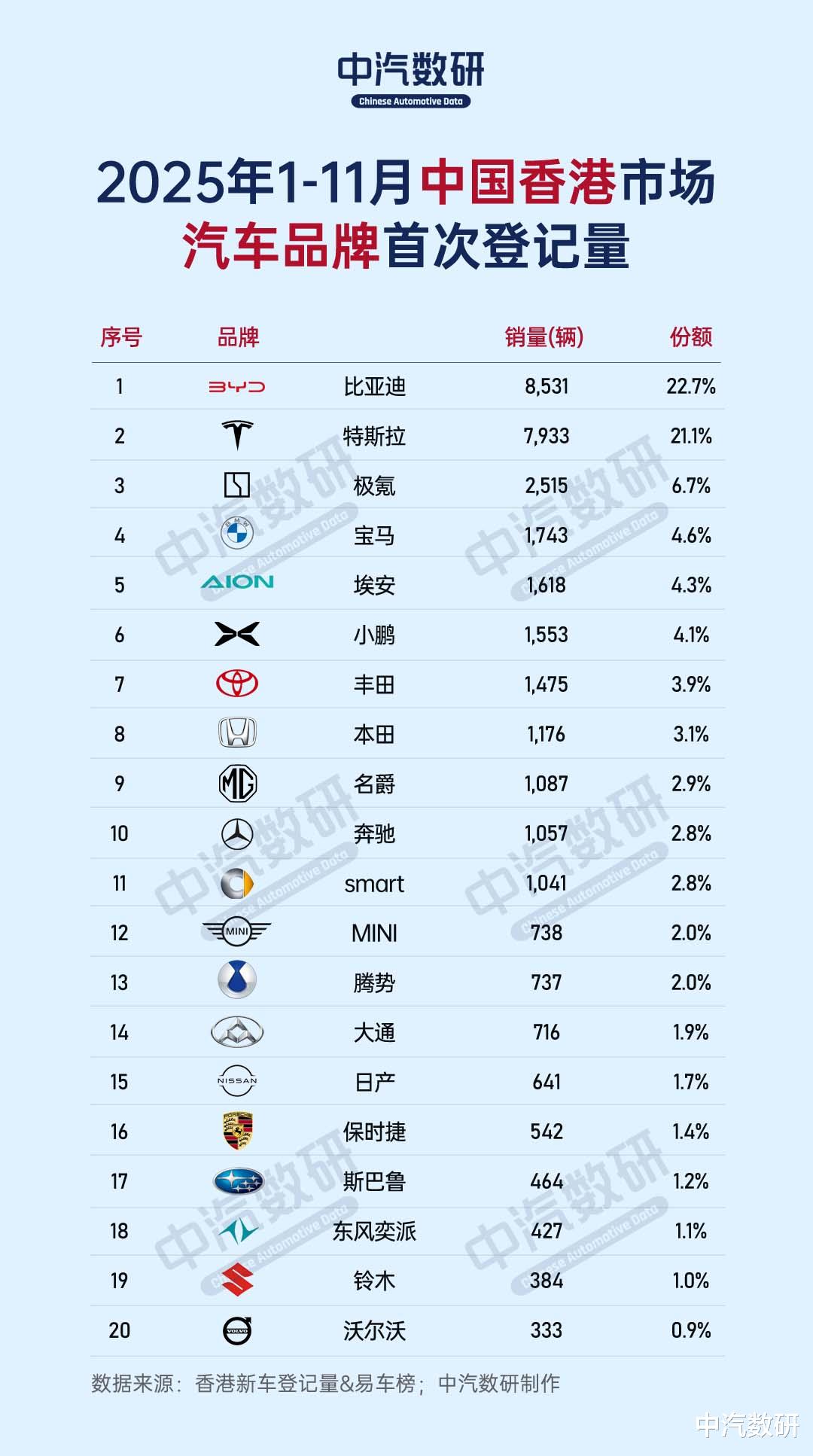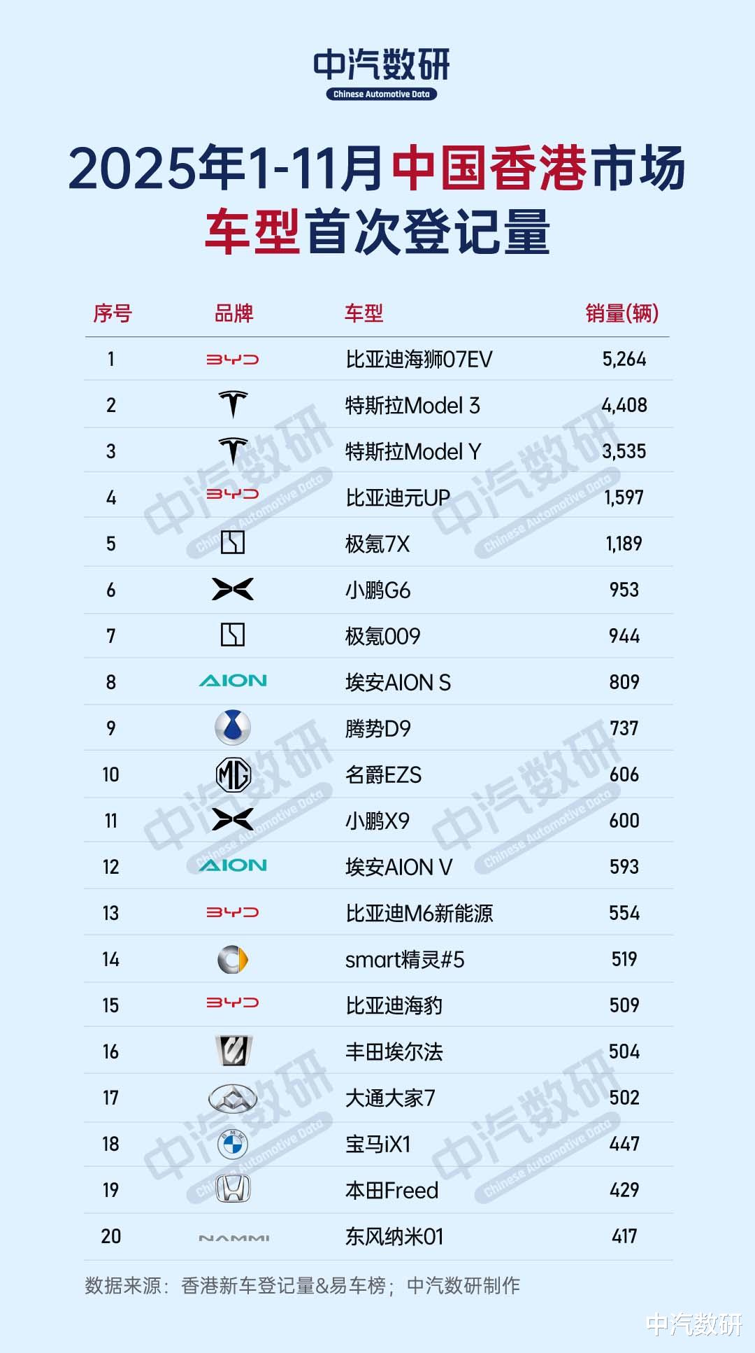 近日,易车榜发布了中国香港地区1-11月汽车品牌及车型销量TOP20。