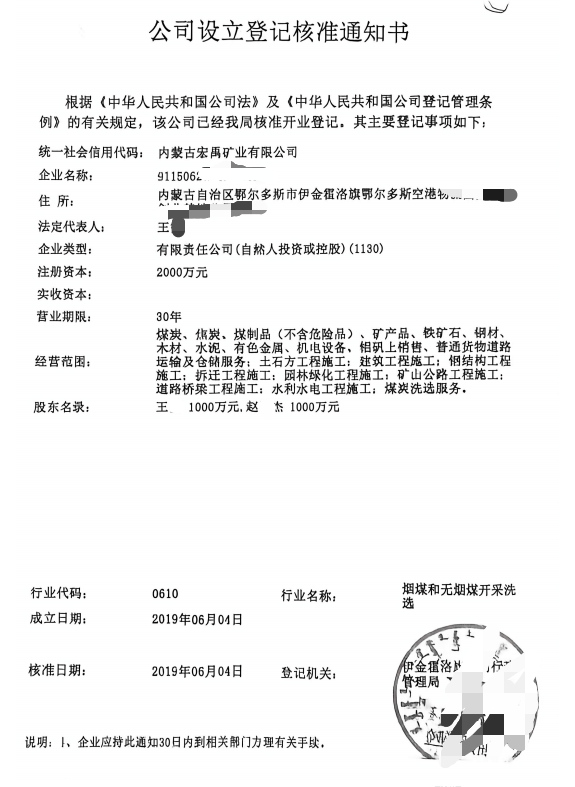 据悉,涉矿企业内蒙古宏某禹矿业有限公司(以下简称“内蒙古宏某禹”)成立于2019年6月,由赵某杰与王某衡各出资50%设立,其中赵某杰的股权初期由第三方代持。