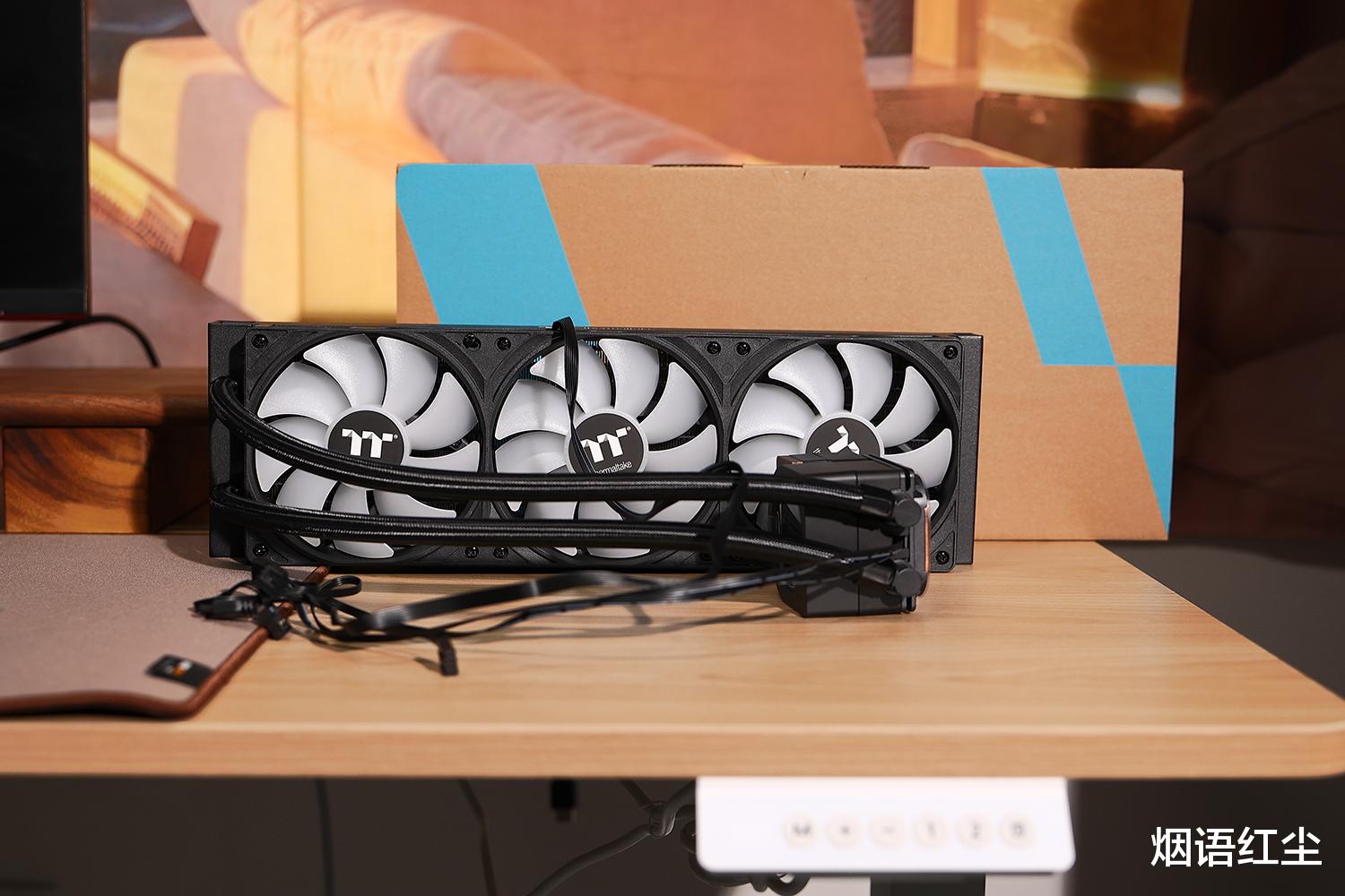 Tt钢影木语360水冷散热器的冷排尺寸为397×120×27mm,采用高密度鳍片设计,散热面积相比普通冷排增加约20%,同时优化了风道设计,降低空气阻力。铝质材质的冷排重量轻且导热性好,兼顾了性能与安装便利性。Tt钢影木语360水冷散热器配备的三把120mm风扇采用一体式设计,理线更加便捷。每把风扇内置8颗ARGB灯珠,支持主流主板的灯效同步,可以通过软件实现1680万色自定义,打造个性化的光效系统。